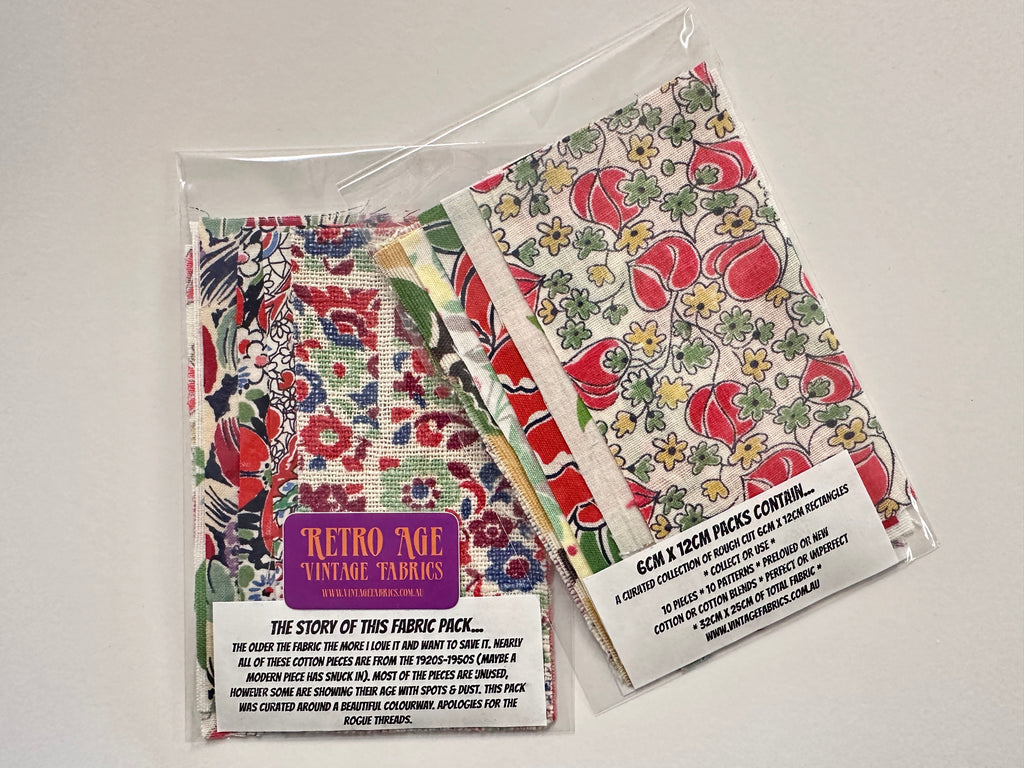 My mid-century packs are all limited edition as I create them with the fabric stock I have - and, as we all know, these old fabrics are very hard to find. The fabrics are all in good condition and ready for design inspiration, coveting or use in craft. Please keep in mind some of these fabrics are almost 100 years old - the colour dyes are different, as is some of the cotton quality and weaving regularity. I either die cut or rotary cut the fabrics, so there will be rogue threads and the pattern placement will vary between packs. I curate each pack until the collection feels 'just right', as I want you, the creator, to receive fabrics you can use together or separately. Each pack is packaged and can be given as gifts.