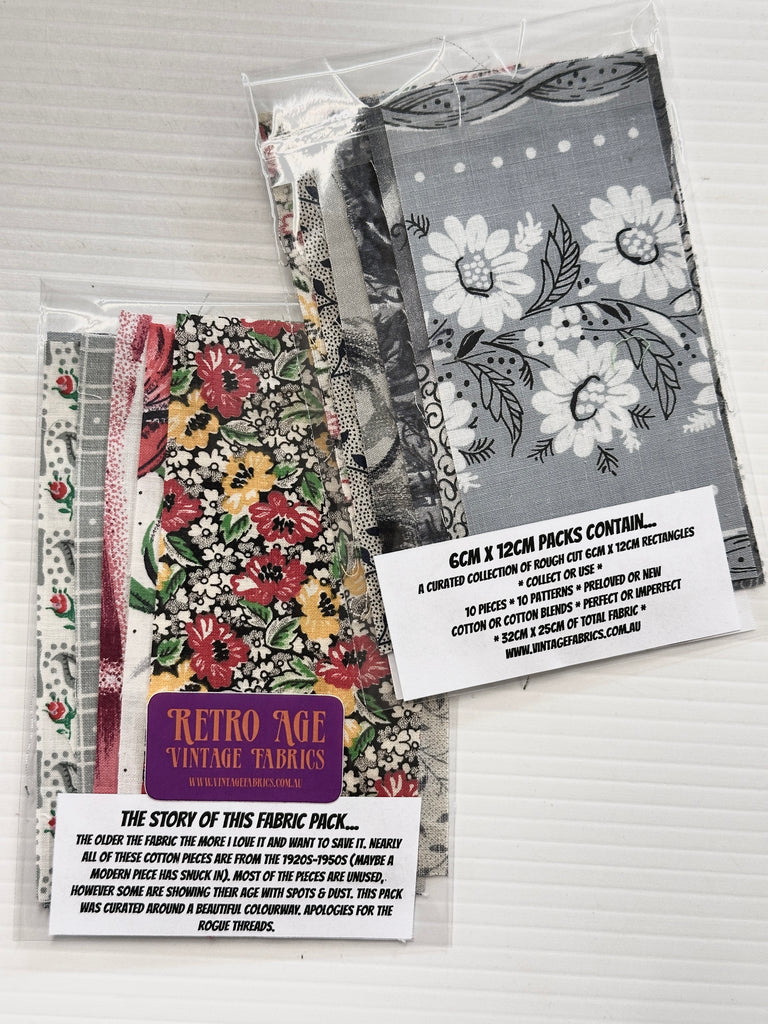My mid-century packs are all limited edition as I create them with the fabric stock I have - and, as we all know, these old fabrics are very hard to find. The fabrics are all in good condition and ready for design inspiration, coveting or use in craft. Please keep in mind some of these fabrics are almost 100 years old - the colour dyes are different, as is some of the cotton quality and weaving regularity. I either die cut or rotary cut the fabrics, so there will be rogue threads and the pattern placement will vary between packs. I curate each pack until the collection feels 'just right', as I want you, the creator, to receive fabrics you can use together or separately. Each pack is packaged and can be given as gifts.