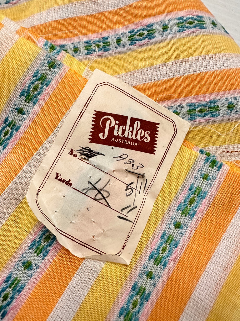 Fabric/Fibre: Light weight woven cotton with a pure mod stripe in salmon, pink, yellow and white and pretty green and blue woven motifs. The white stripe has a textured weave. This had the original Pickles Australia tag still attached, but it has now been removed.