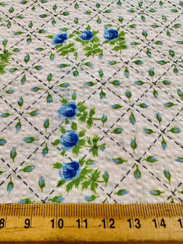 Fabric/Fibre: light weight cotton plisse with a cream base and a delightful all over blue and green floral pattern that has a very ‘hippie meadow’ feel.
