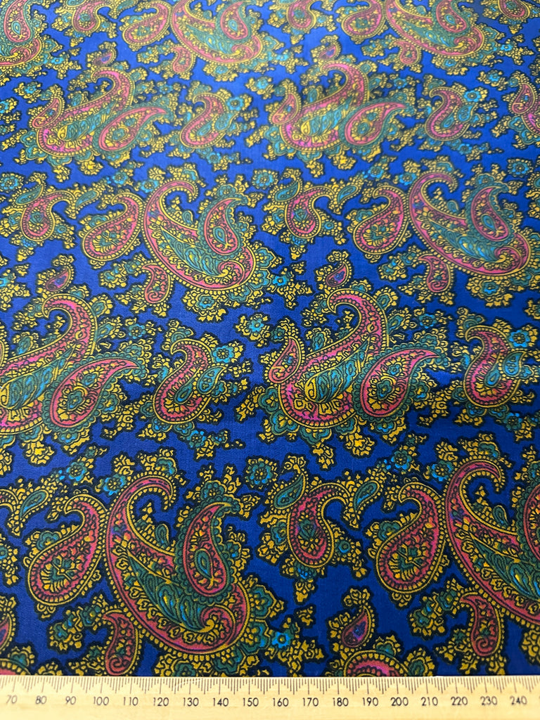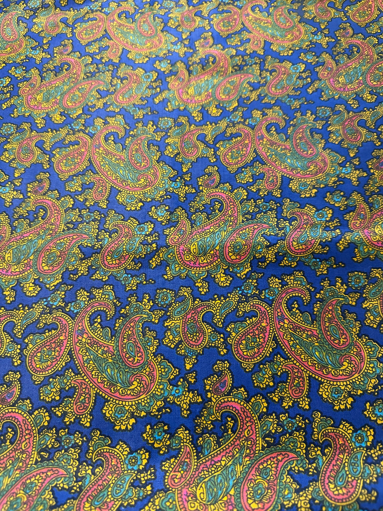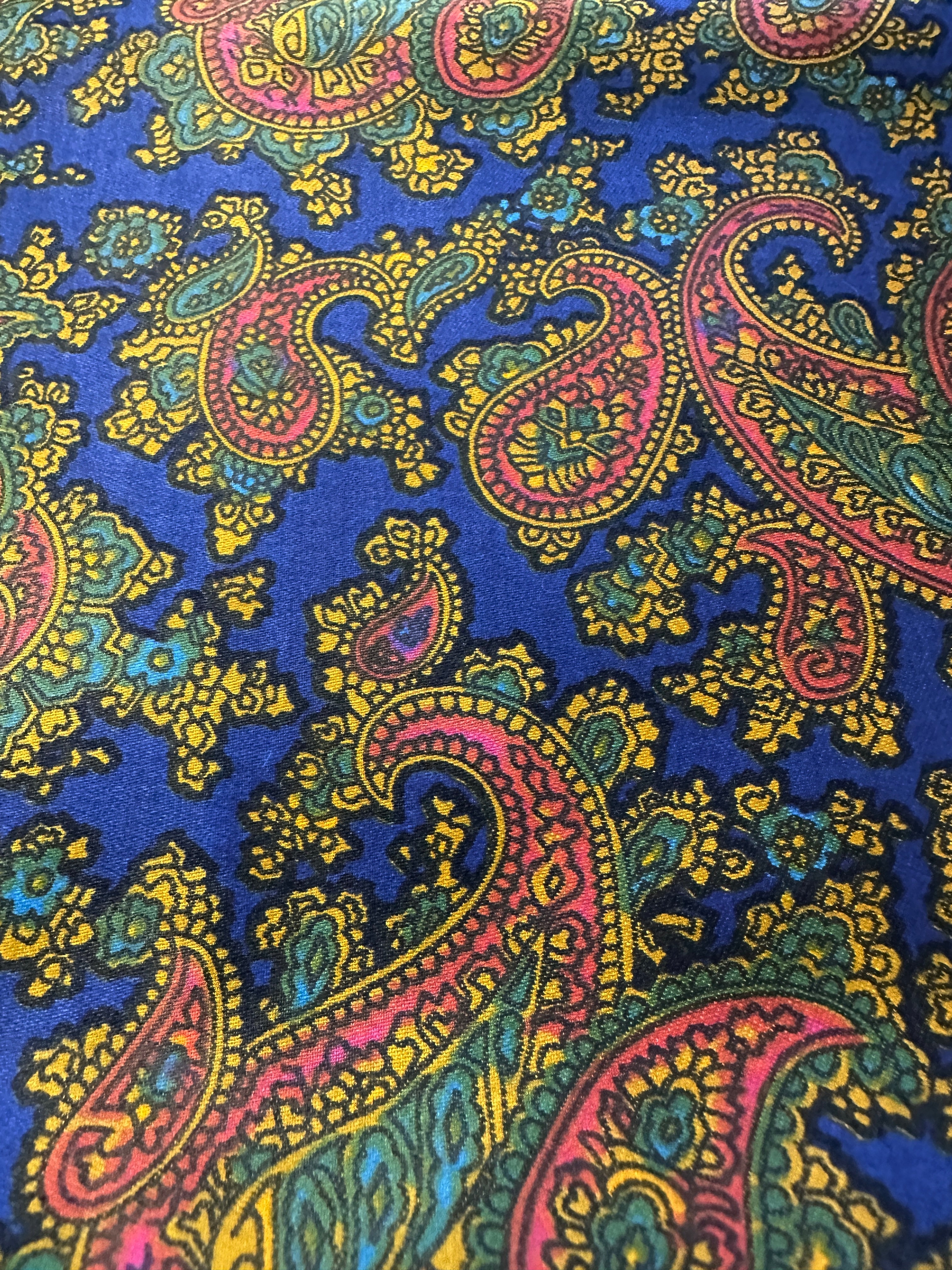 Fabric/Fibre: vintage 1960s or 70s high end polished cotton with a cobalt blue base and an all over paisley pattern in gold mustard, pink, greens and blues.