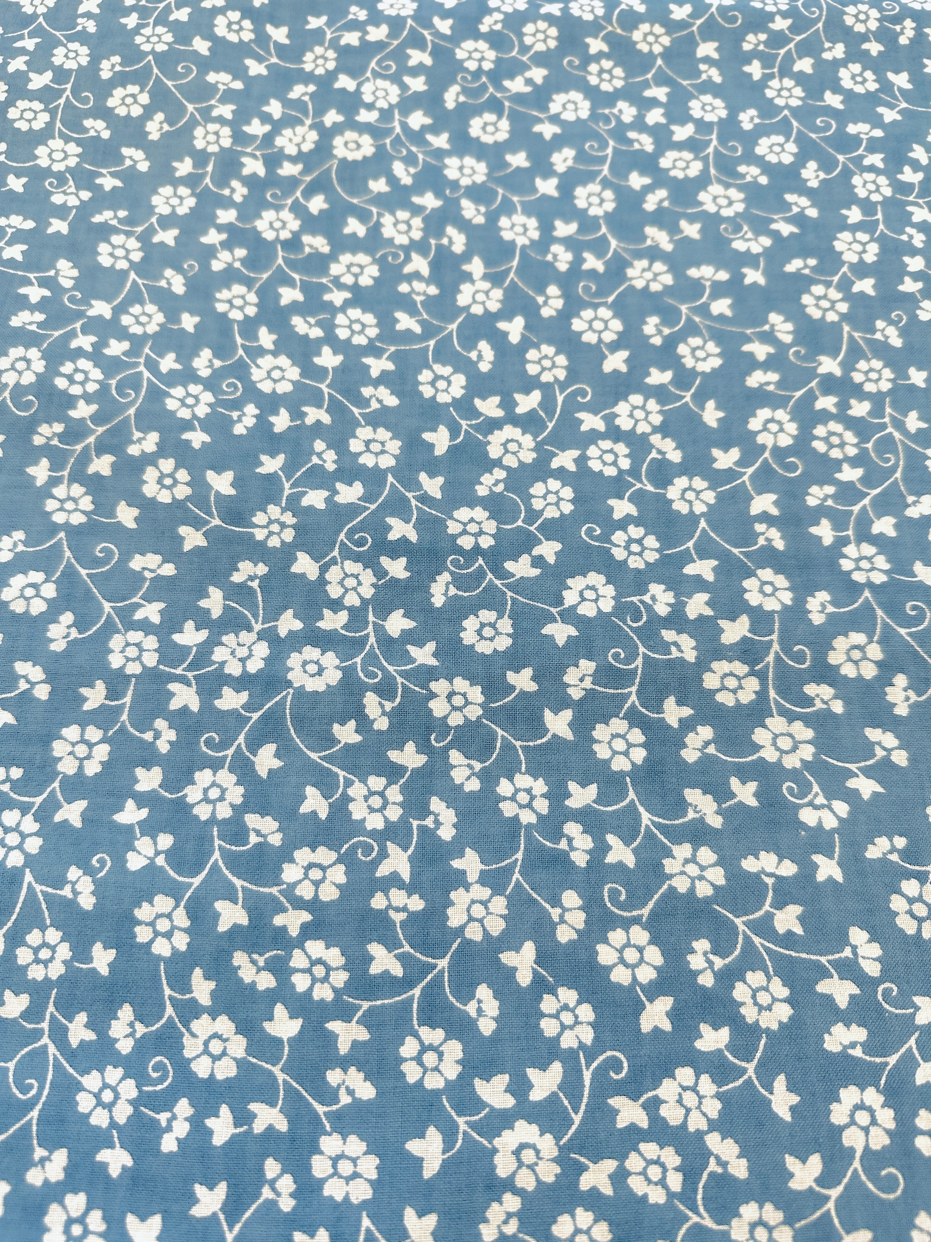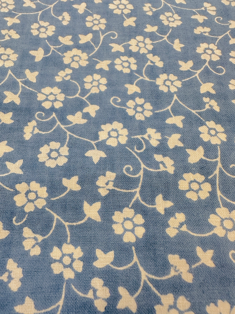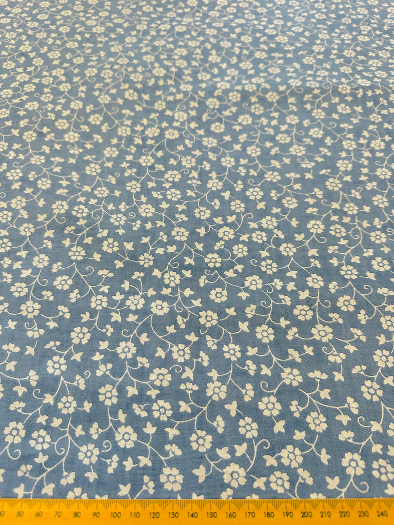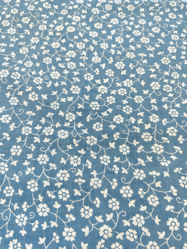 Vintage Fabric 1980s Laura Ashley Style Dusky Blue Base w/ White Floral 118cm Wide