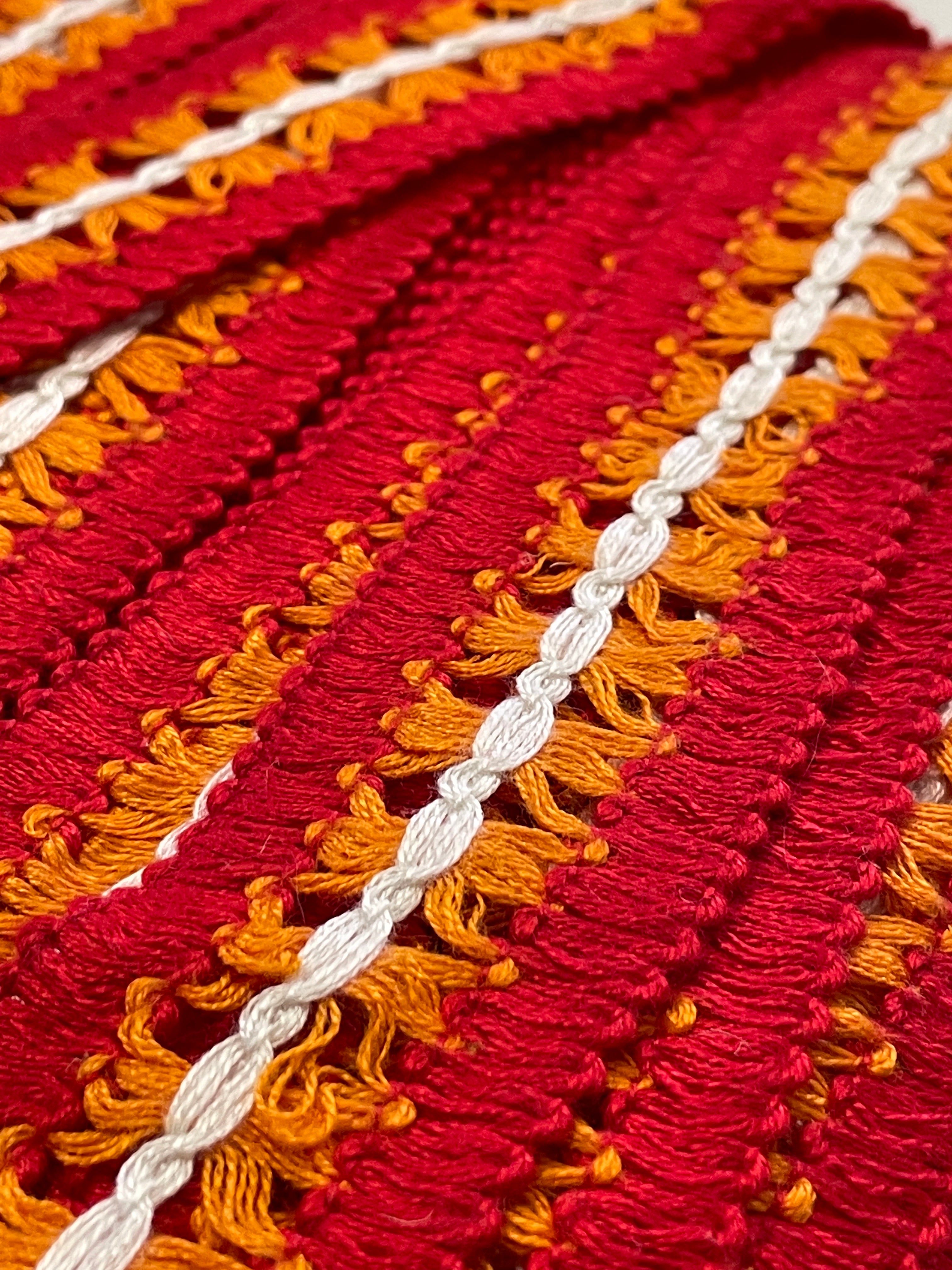 Trim: divine woven trim/braid in bright red, orange and white. Soft to the touch, so we're leaning towards a cotton/rayon blend. Lovely and textured and very pliable.
