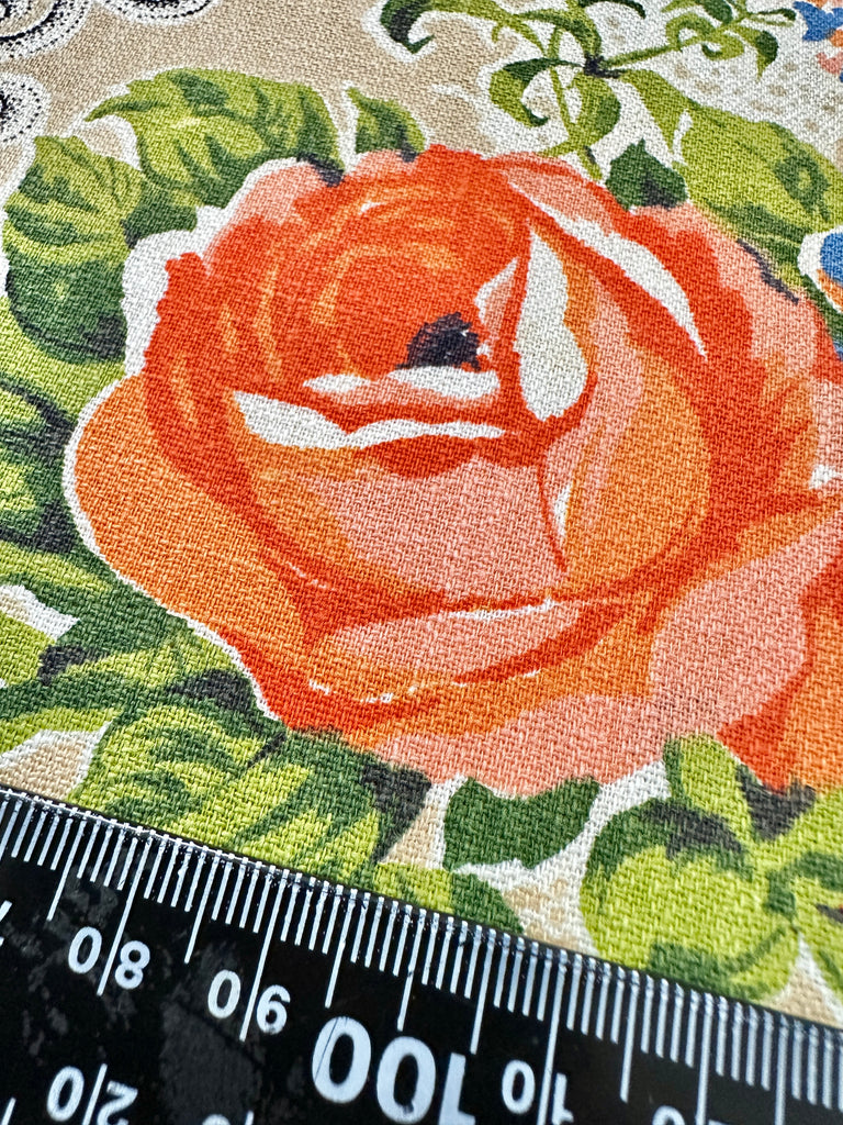 FAT QUARTER Vintage Fabric 1950s Flowers on Tan Cotton Cretonne 43cm x 50cm