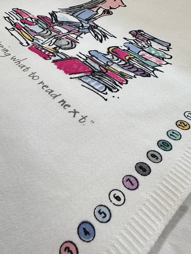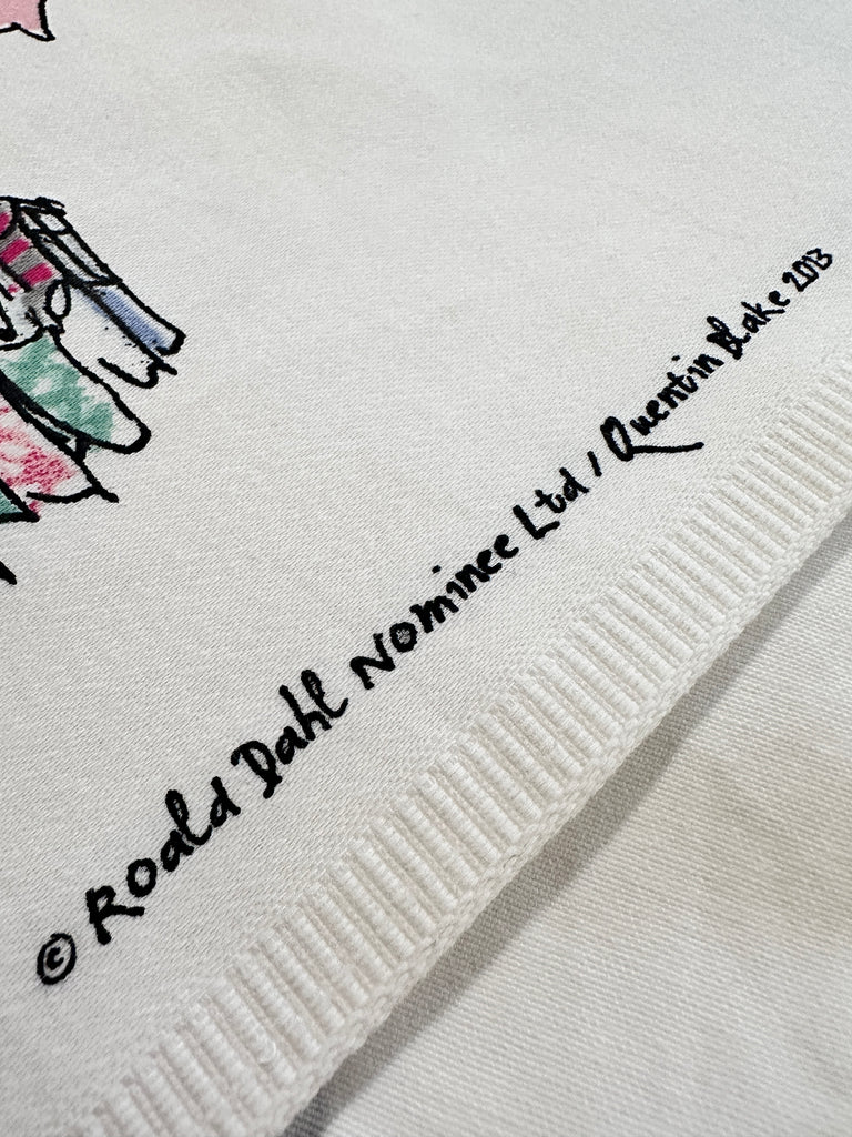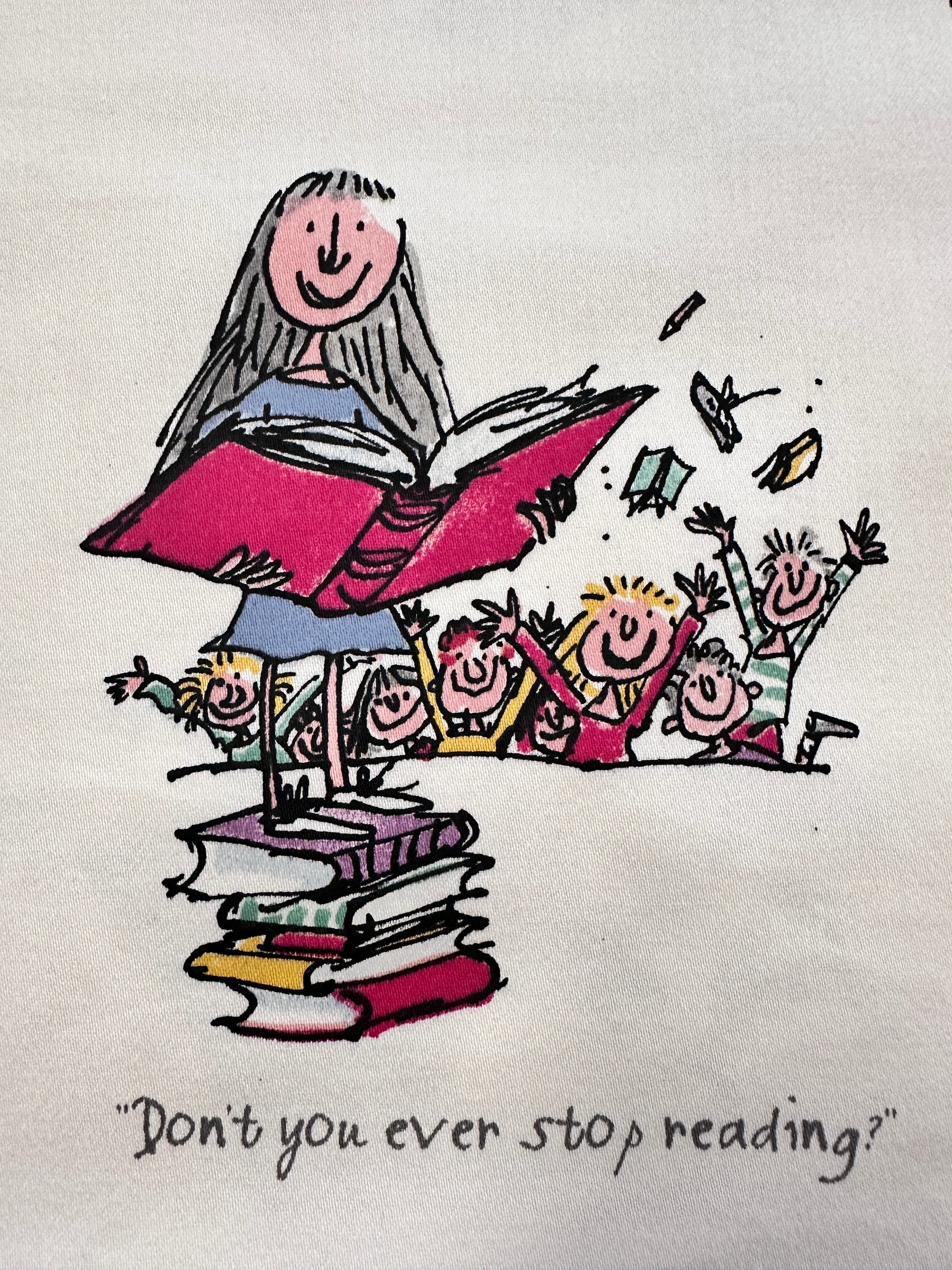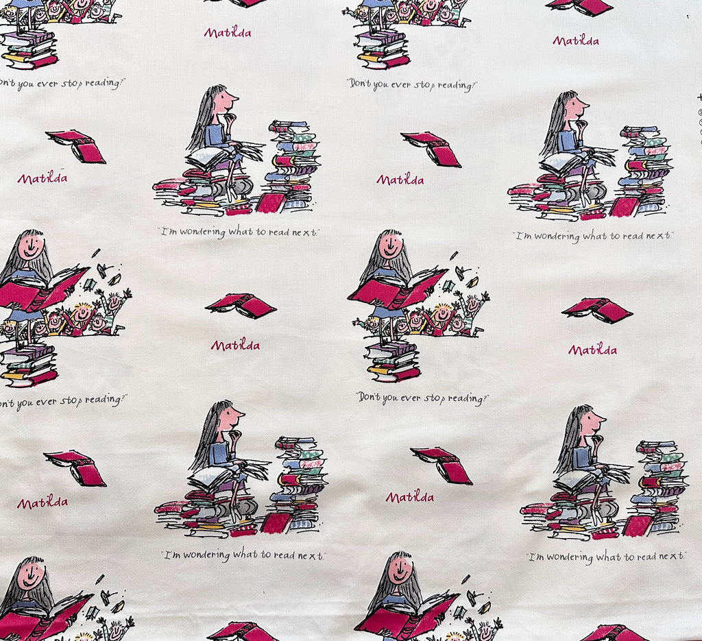 Fabric/Fibre: drapery and soft furnishing weight cotton featuring illustrations by Quentin Blake from Roald Dahl’s Matilda.