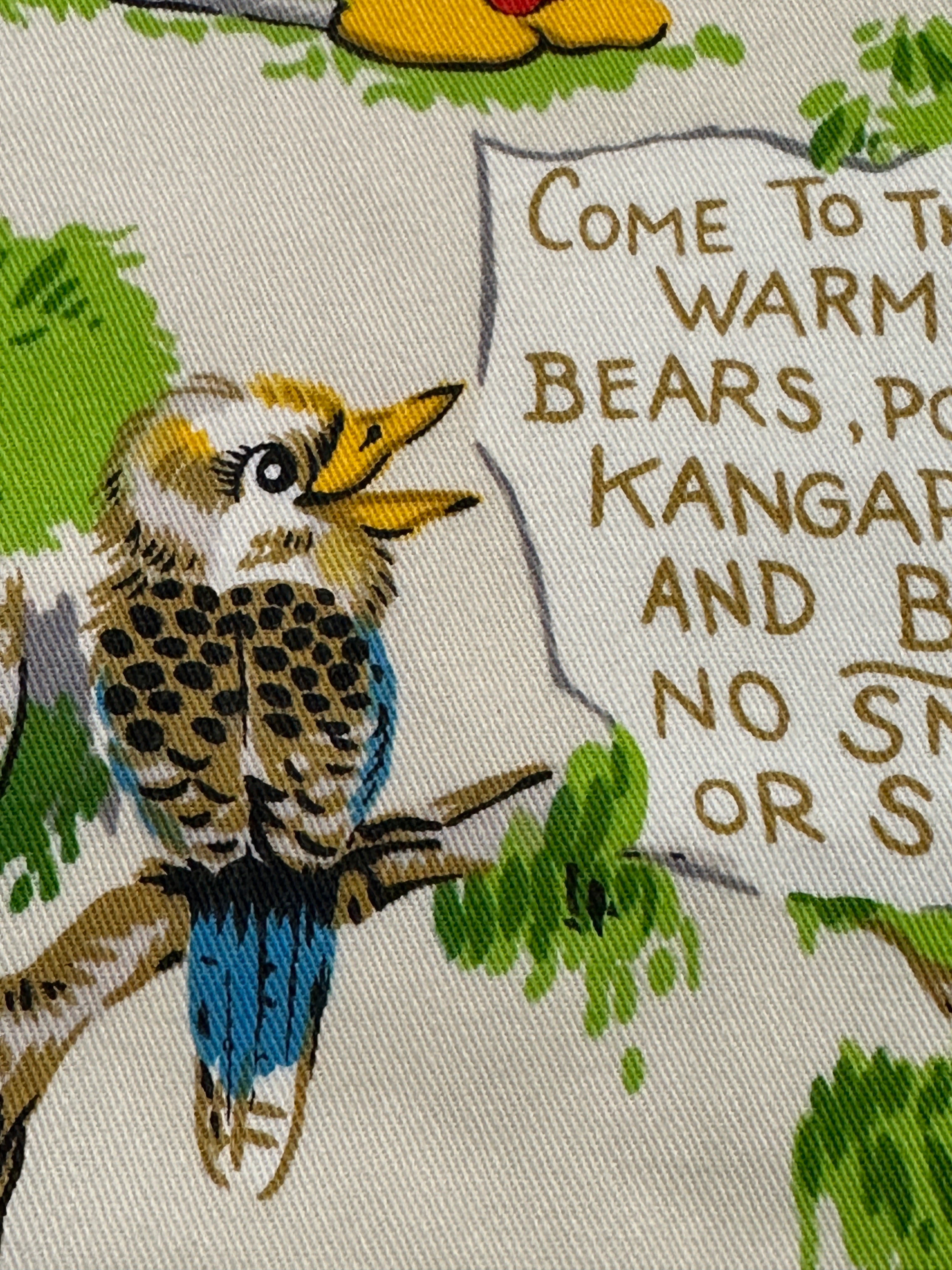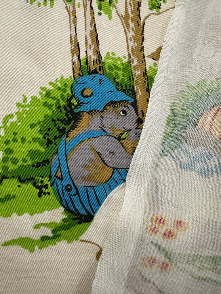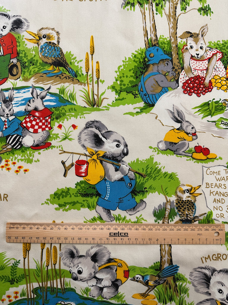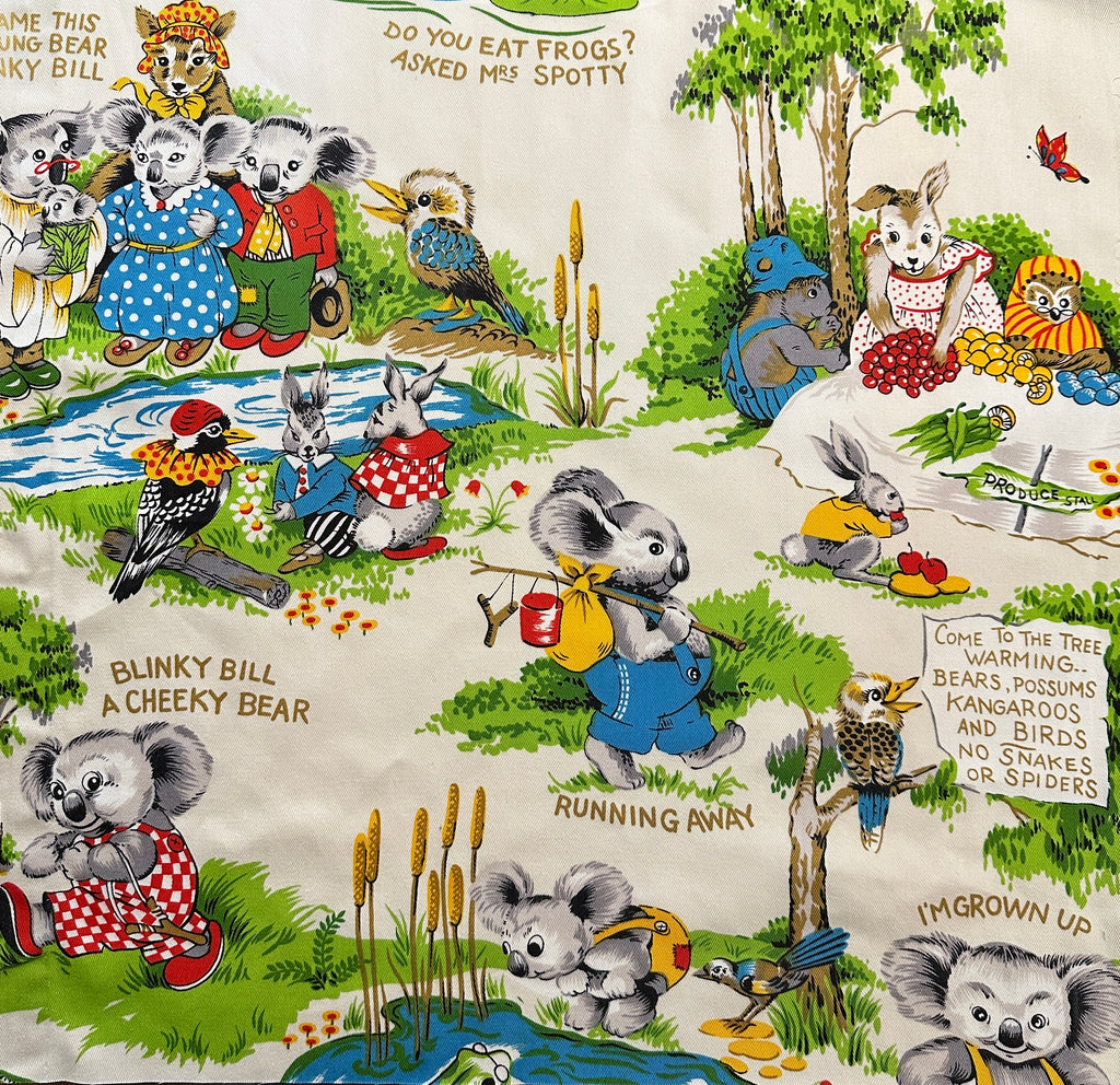 Fabric/Fibre: hard-to-come-by Blinky Bill soft furnishing cotton (light weight drill) with a delightful pattern featuring Blinky Bill and his friends. The fifth photo shows the whole piece.