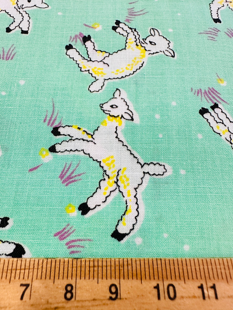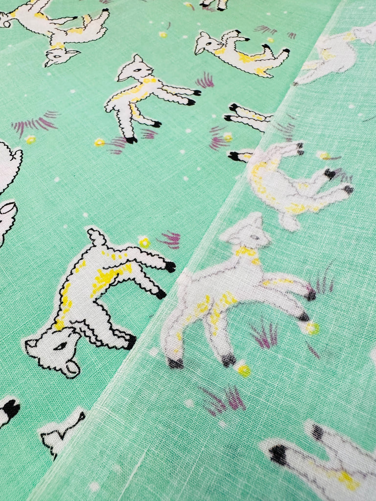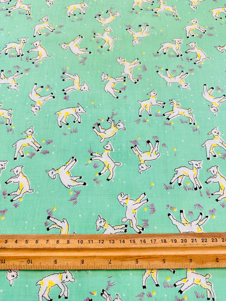 Vintage Fabric 1940s 50s Delightful Frolicking Lambs on Green Crispy Cotton 88cm Wide
