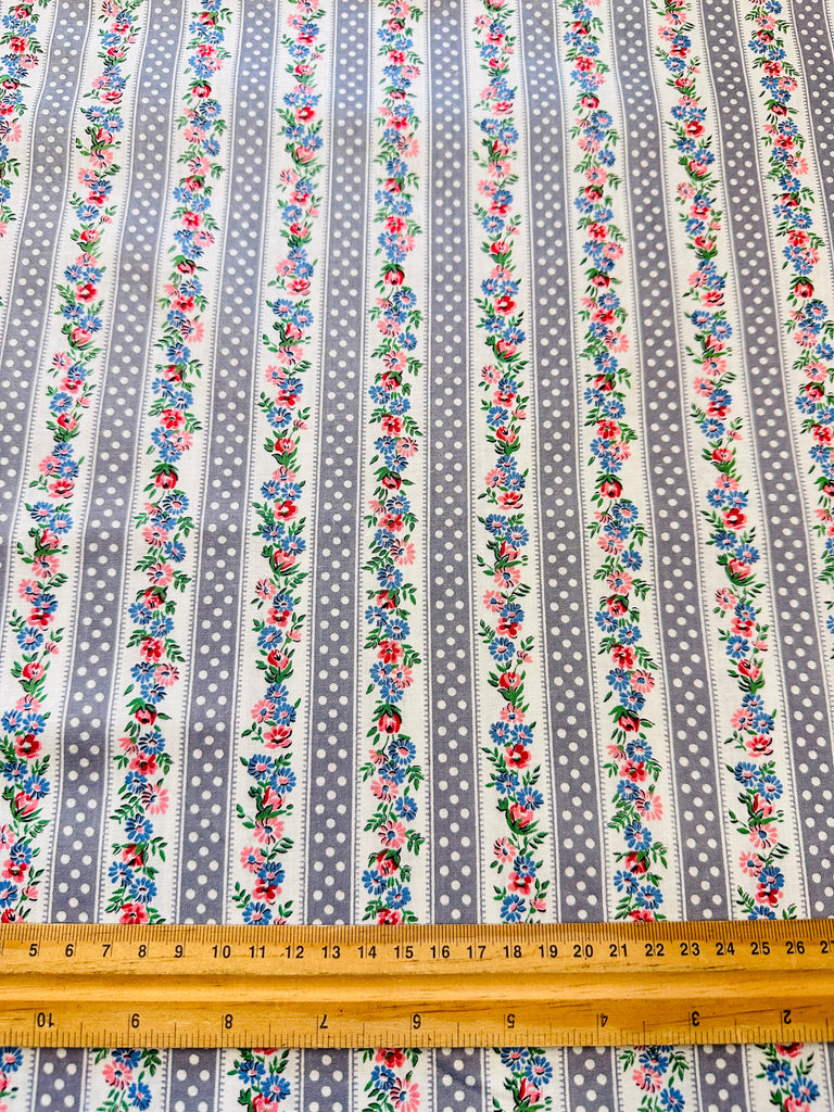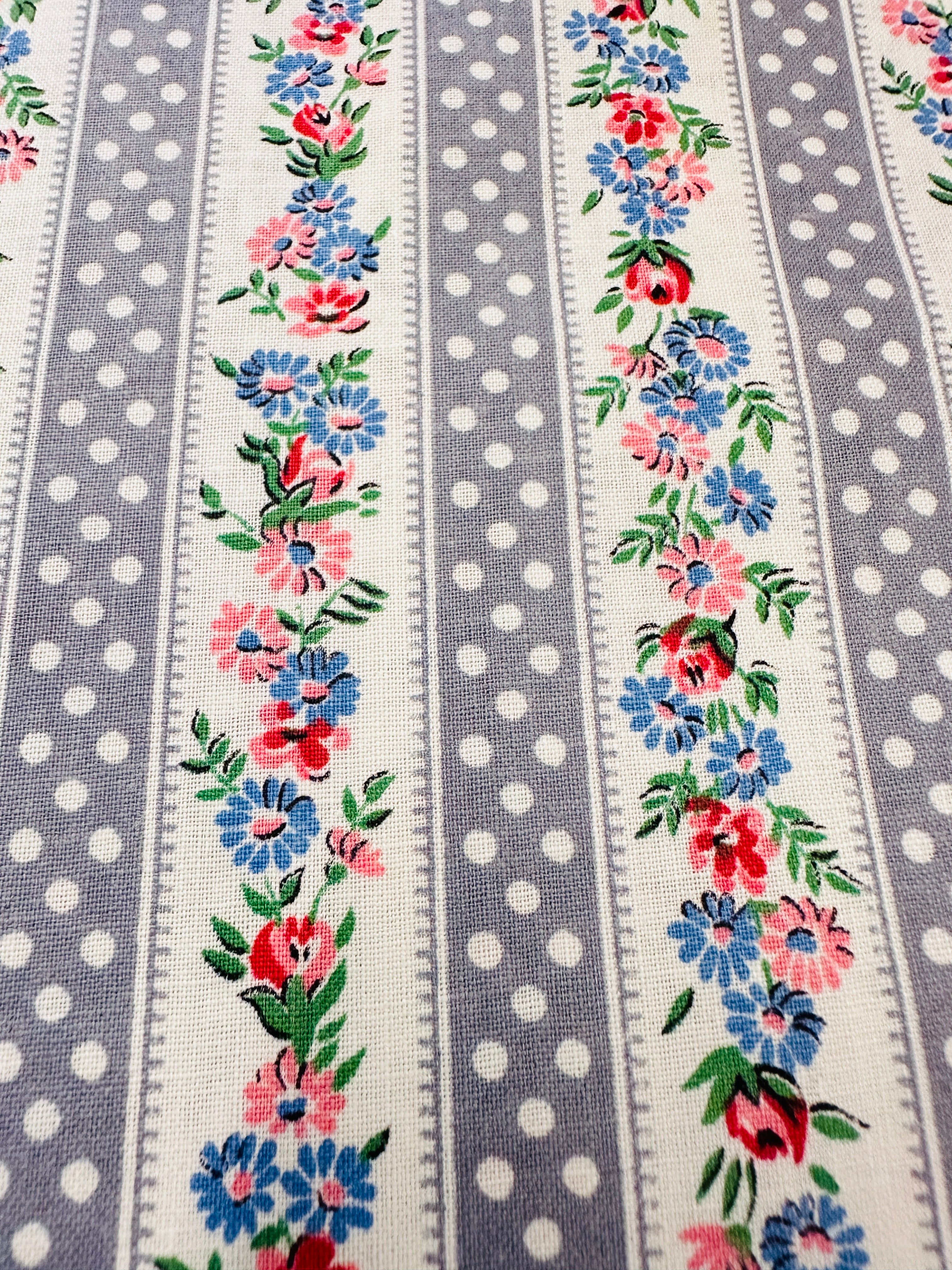 Fabric/Fibre: delightful late 40s/50s slightly crispy densely woven cotton with a small floral motif and classic white dots in cool grey stripes.