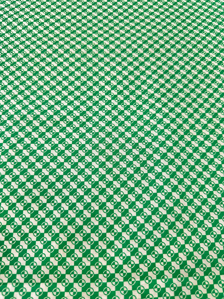 Fabric/Fibre: this is a light weight slightly crispy dress cotton with an Art Deco green shape all-over pattern. It’s a true apple green.