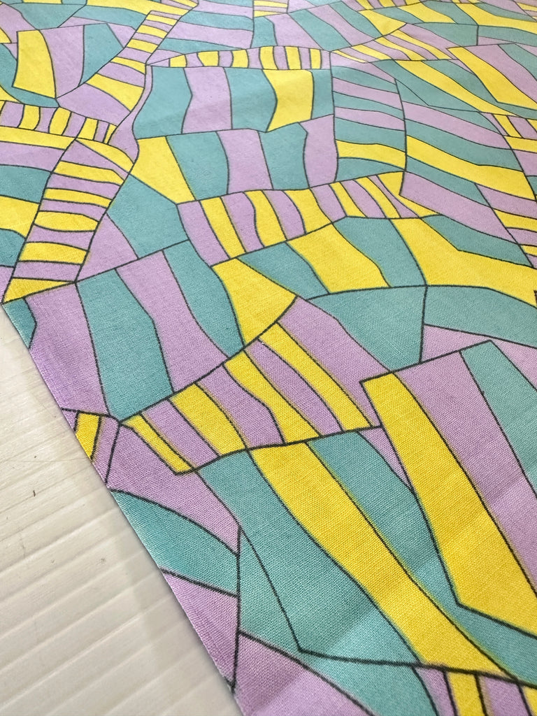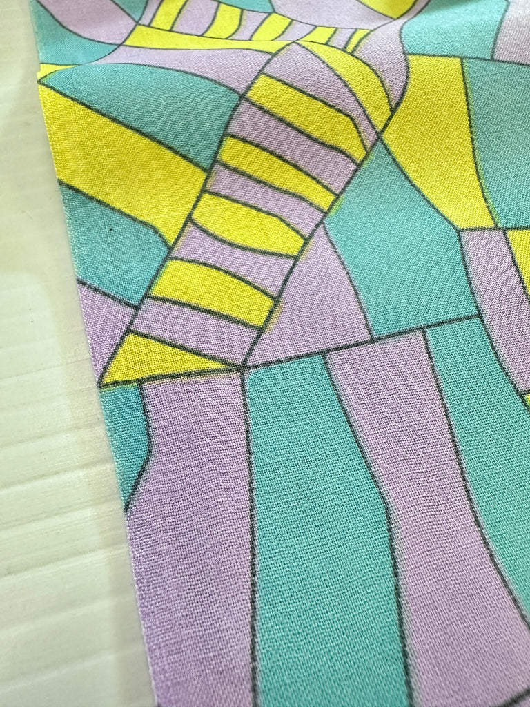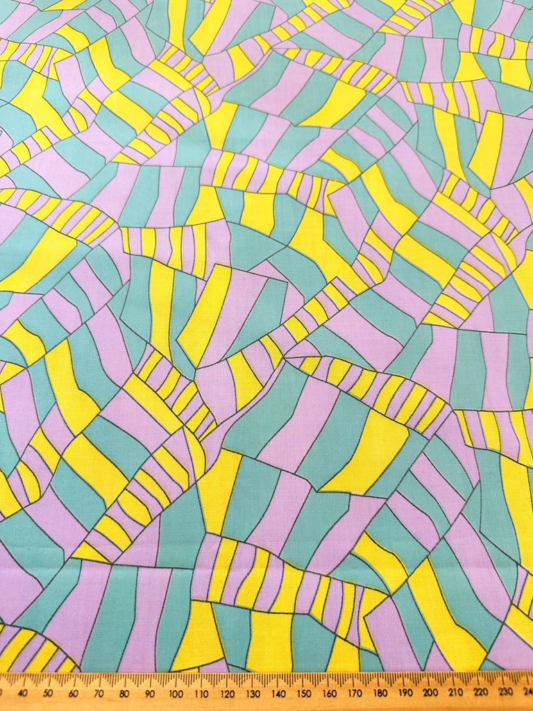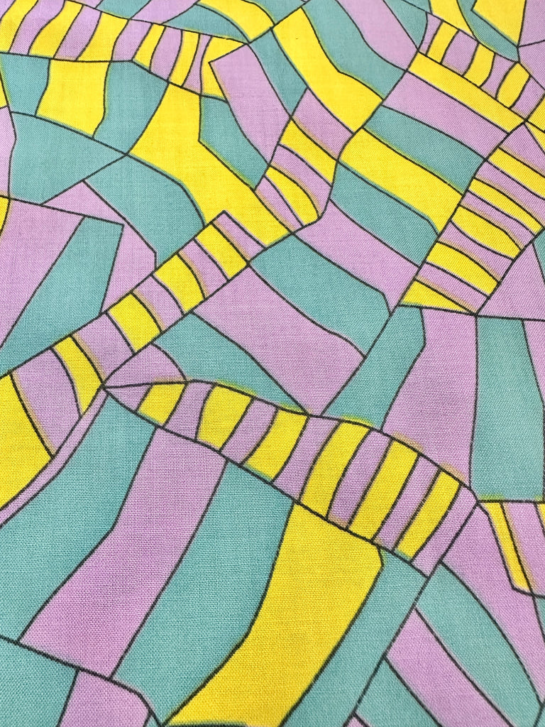 Fabric/Fibre: light weight densely woven cotton poplin with a loud mod abstract print in purple, teal and yellow. Lively and crisp with an amazing print.