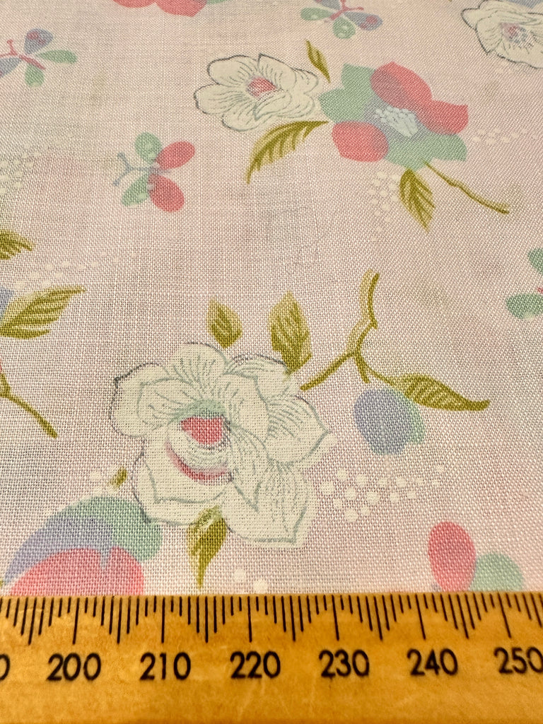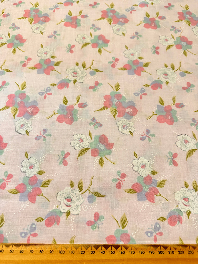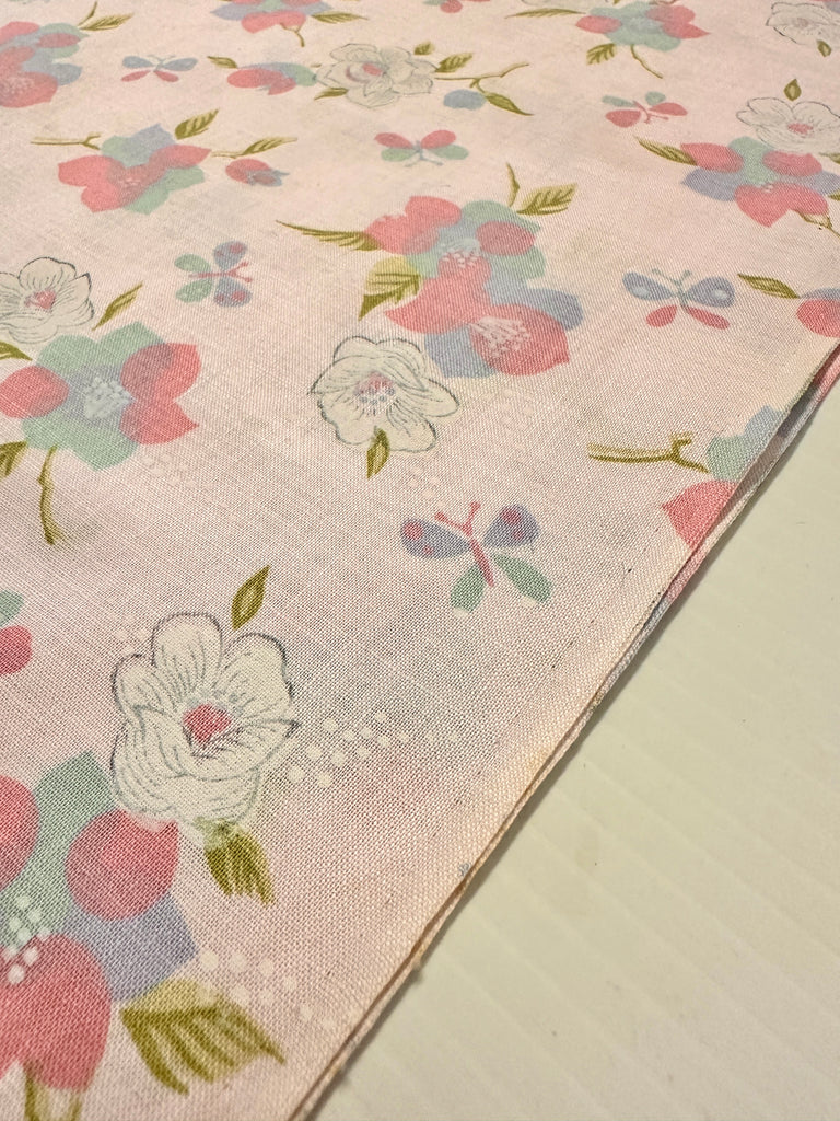 Vintage Fabric 1960s Butterflies & Flowers on Pink Cotton 88cm Wide
