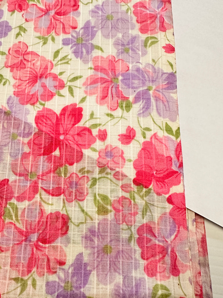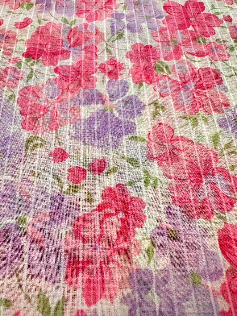 Fabric/Fibre: light weight swoven cotton and polyester blend with a bright floral pattern on a fancy woven base. Slight loose weave. Lively and crisp with an amazing print. As you can see in the last photos, it is slightly sheer.