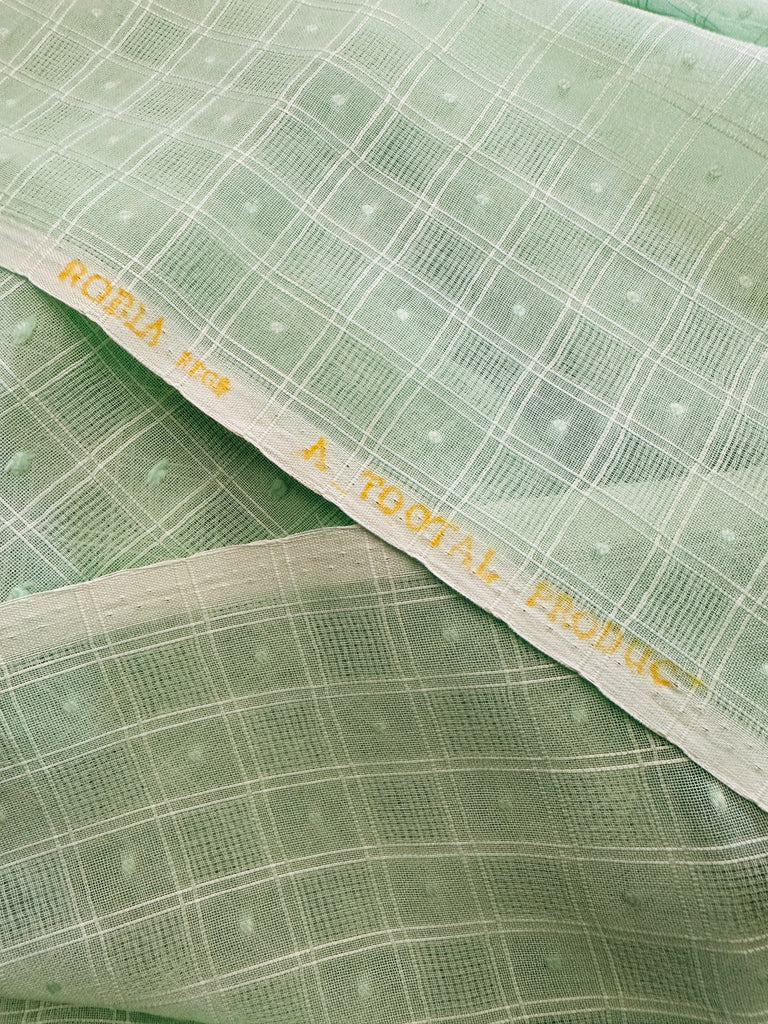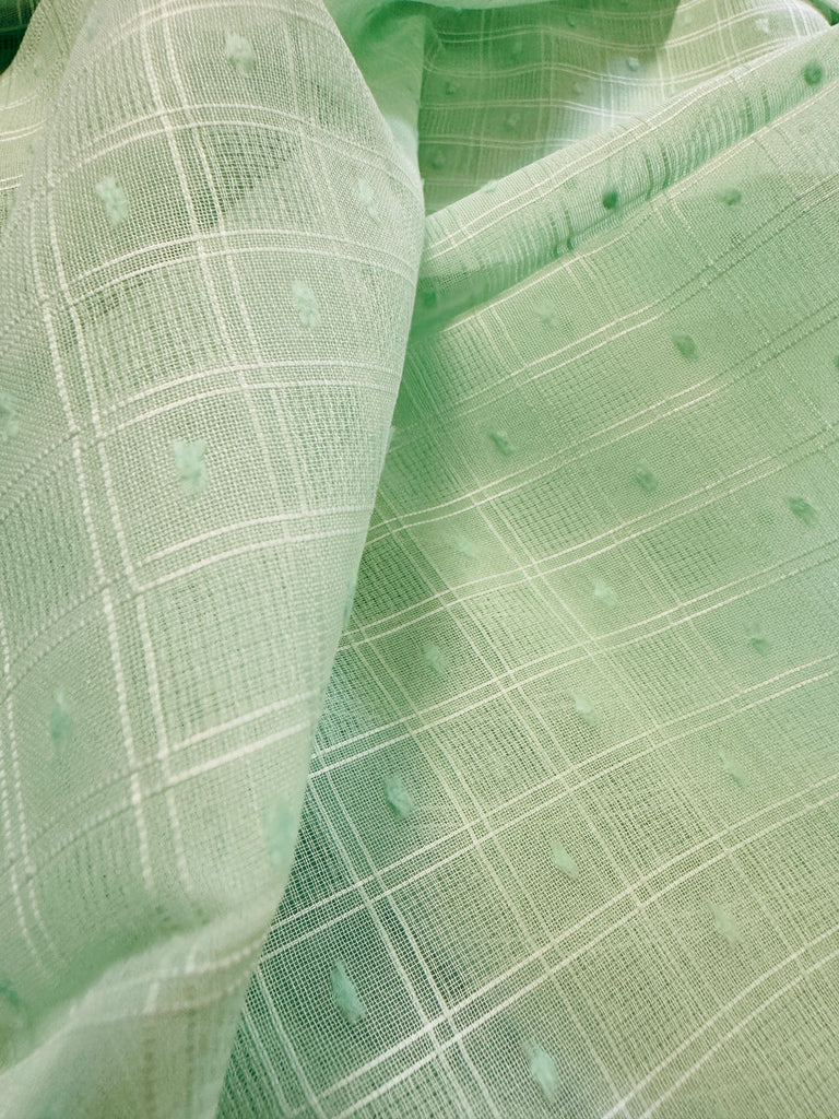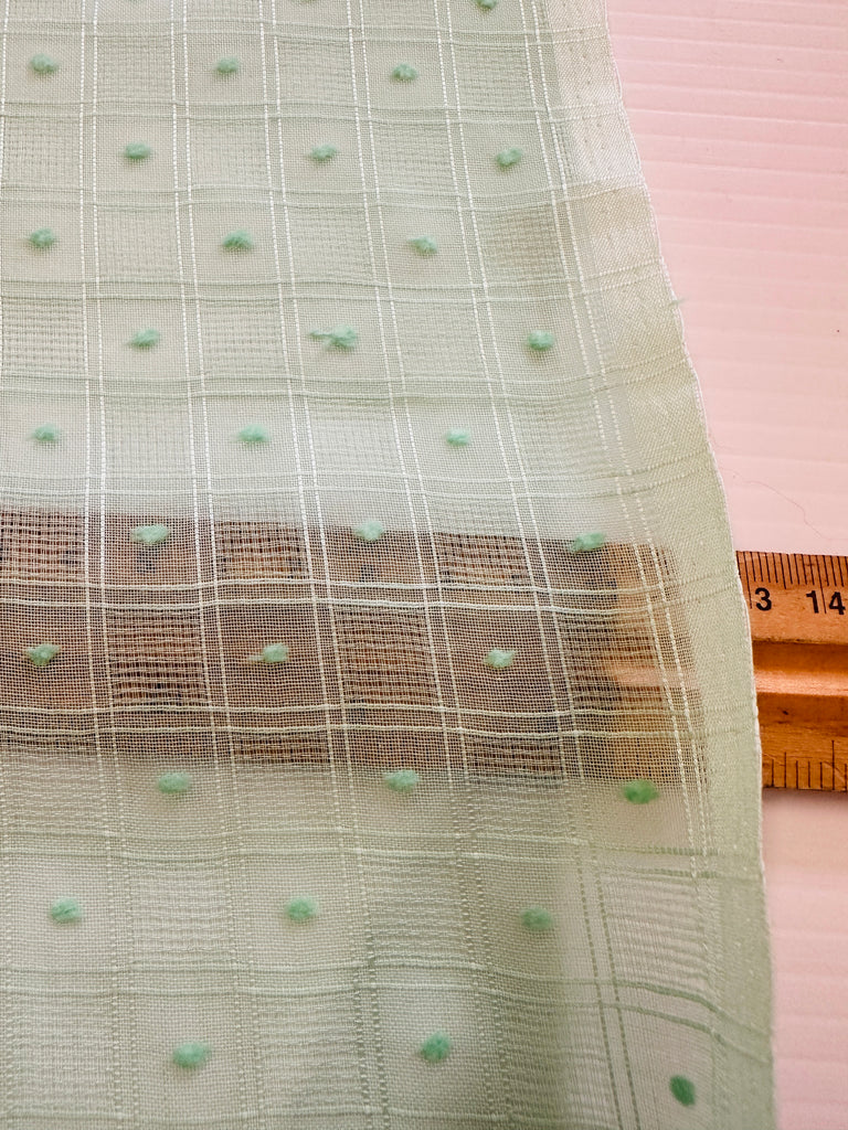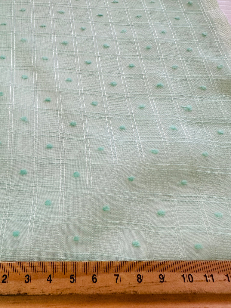 Fabric/Fibre: very light weight Tootal Robia fancy weave ‘dotted Swiss’ cotton in a pale mint. The spots are woven and 'tufted' (not flocked and not flat). This is a voile - see the last photo to see how sheer it is. Manufactured for blouses and kiddies weave back in the day.