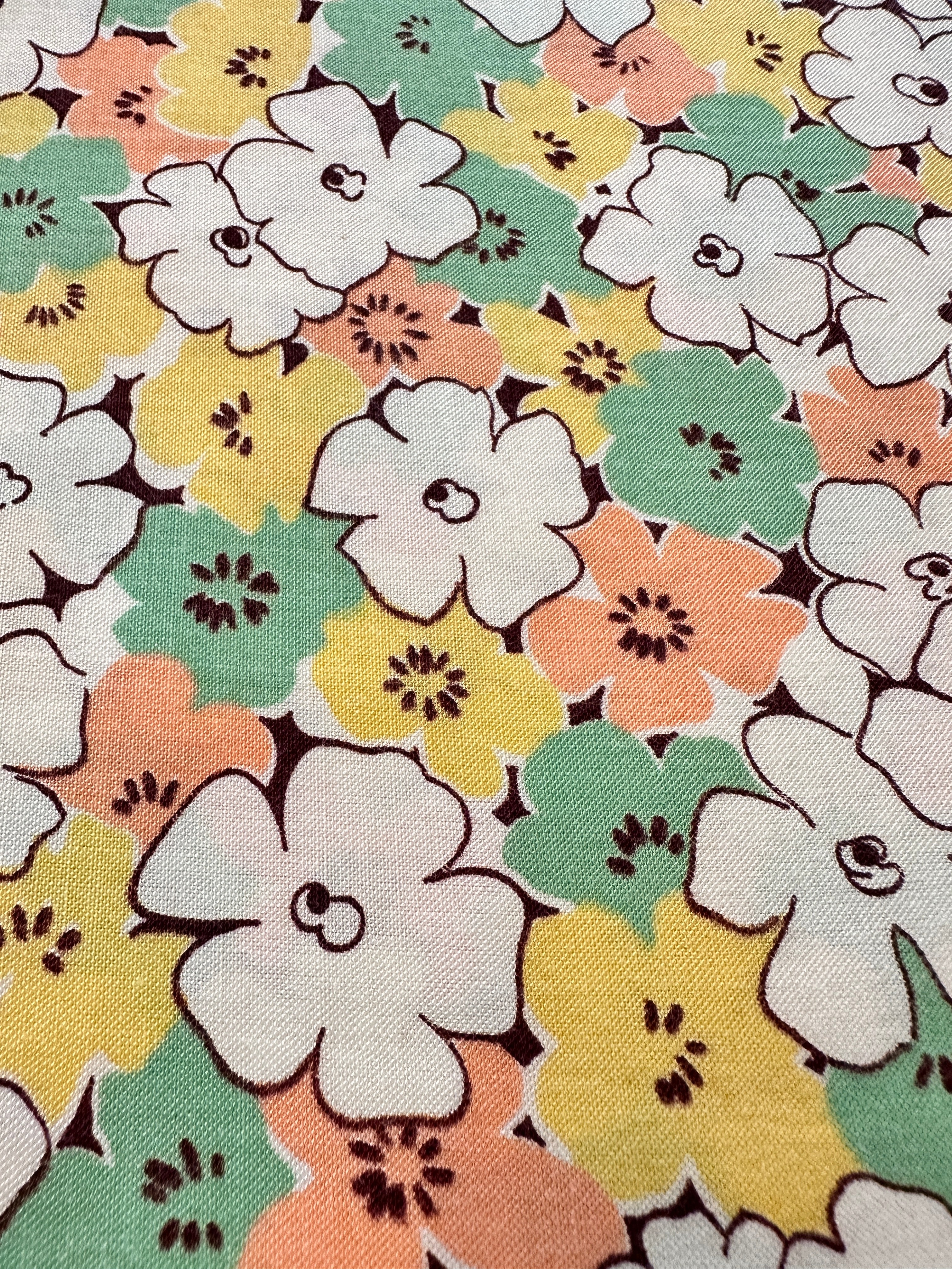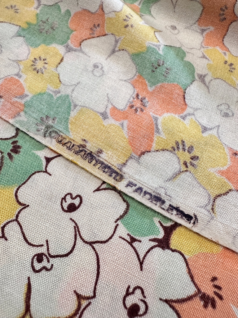 Fabric/Fibre: this is a light weight floppy dress cotton (it may have some rayon, as well) with a delightful floral pattern in the classic Art Deco green, dark salmon, pale gold and chocolate brown. These old fabrics and now ridiculously hard to find, so I am finding myself patting every piece hello and goodbye!