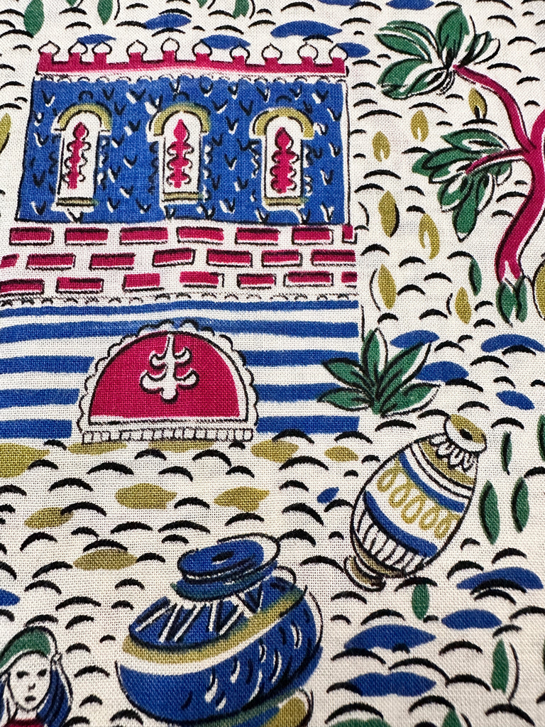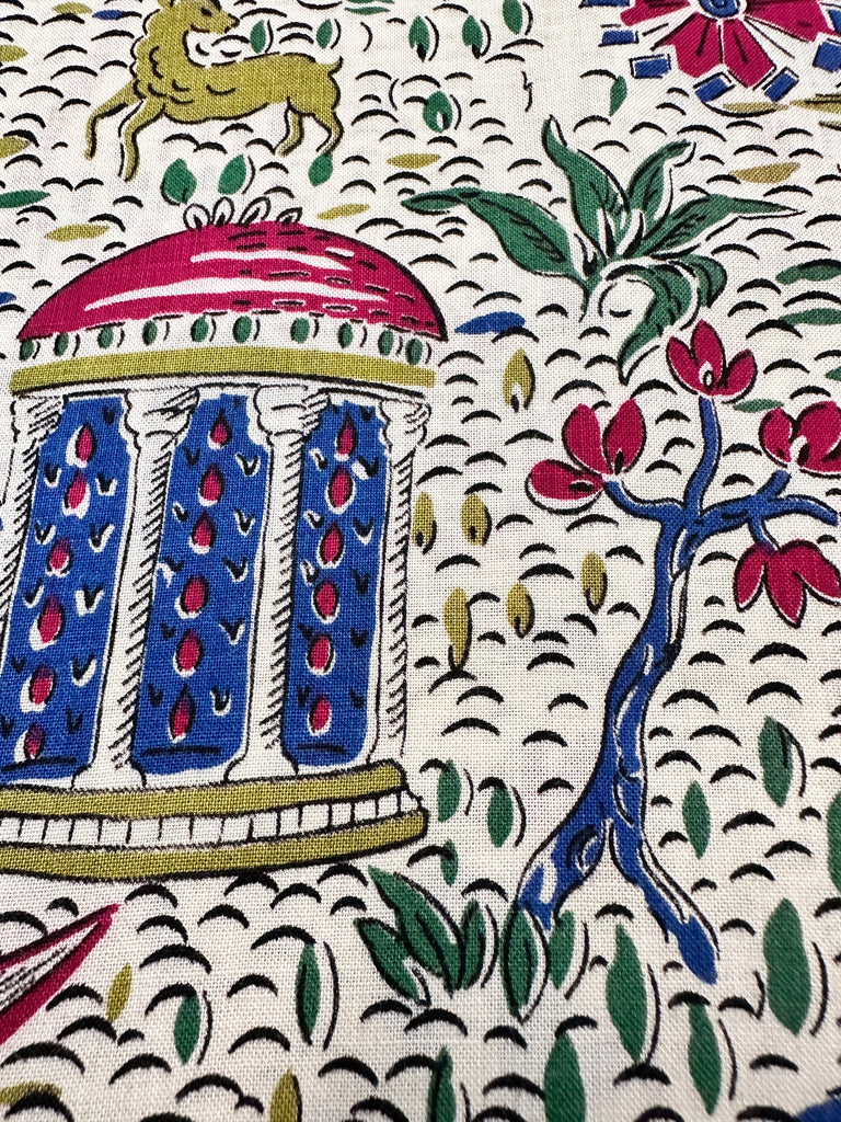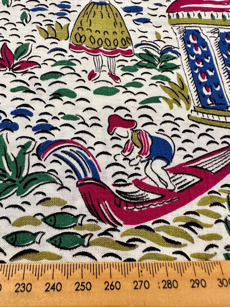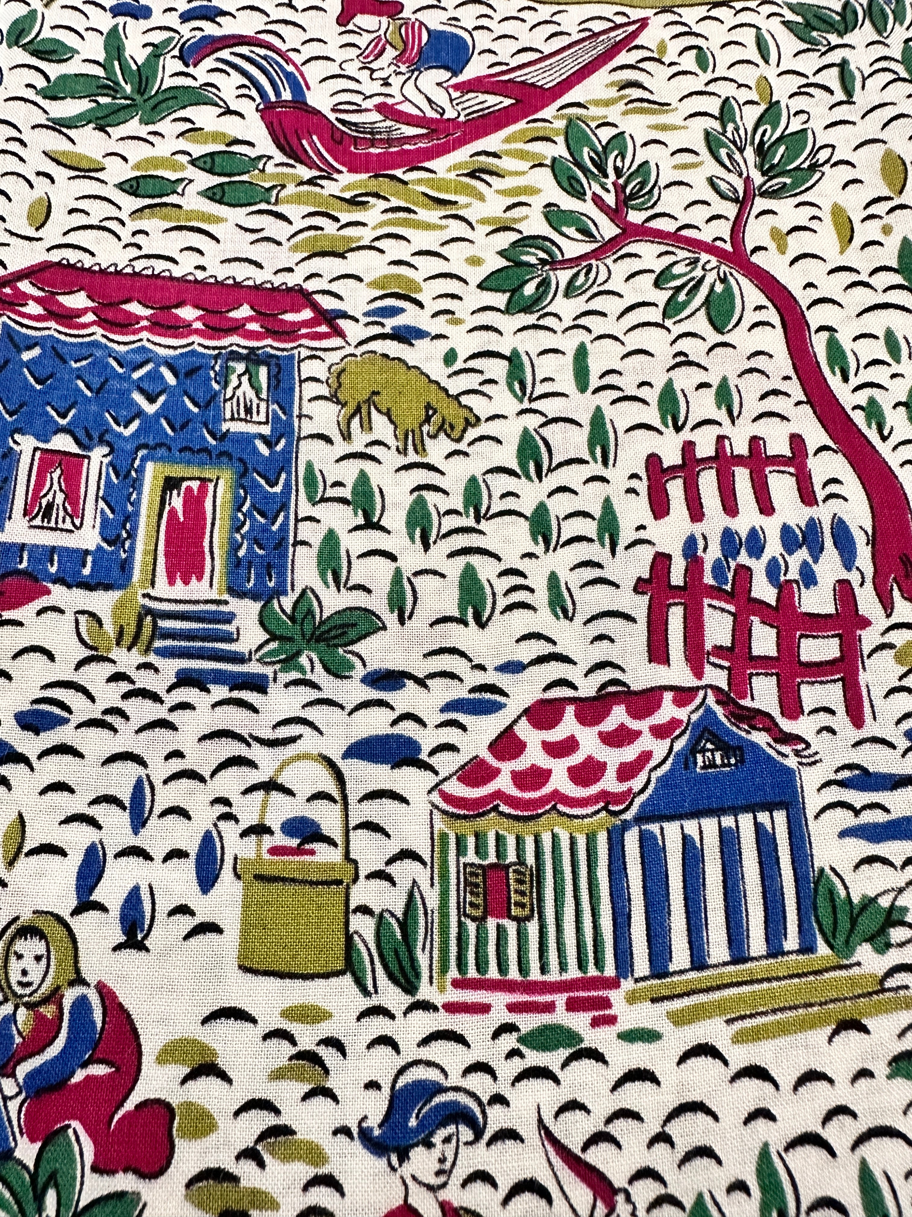 Vintage Fabric 40s 50s Folk Art Landscape Dress Cotton 88cm Wide
