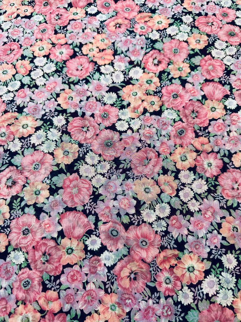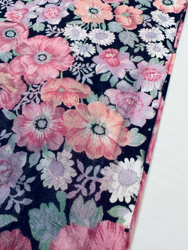 Fabric/Fibre: light weight cotton voile with a black base and a busy floral pattern in cool pinks, purples, greens and white. The last photo shows a ruler beneath the fabric.