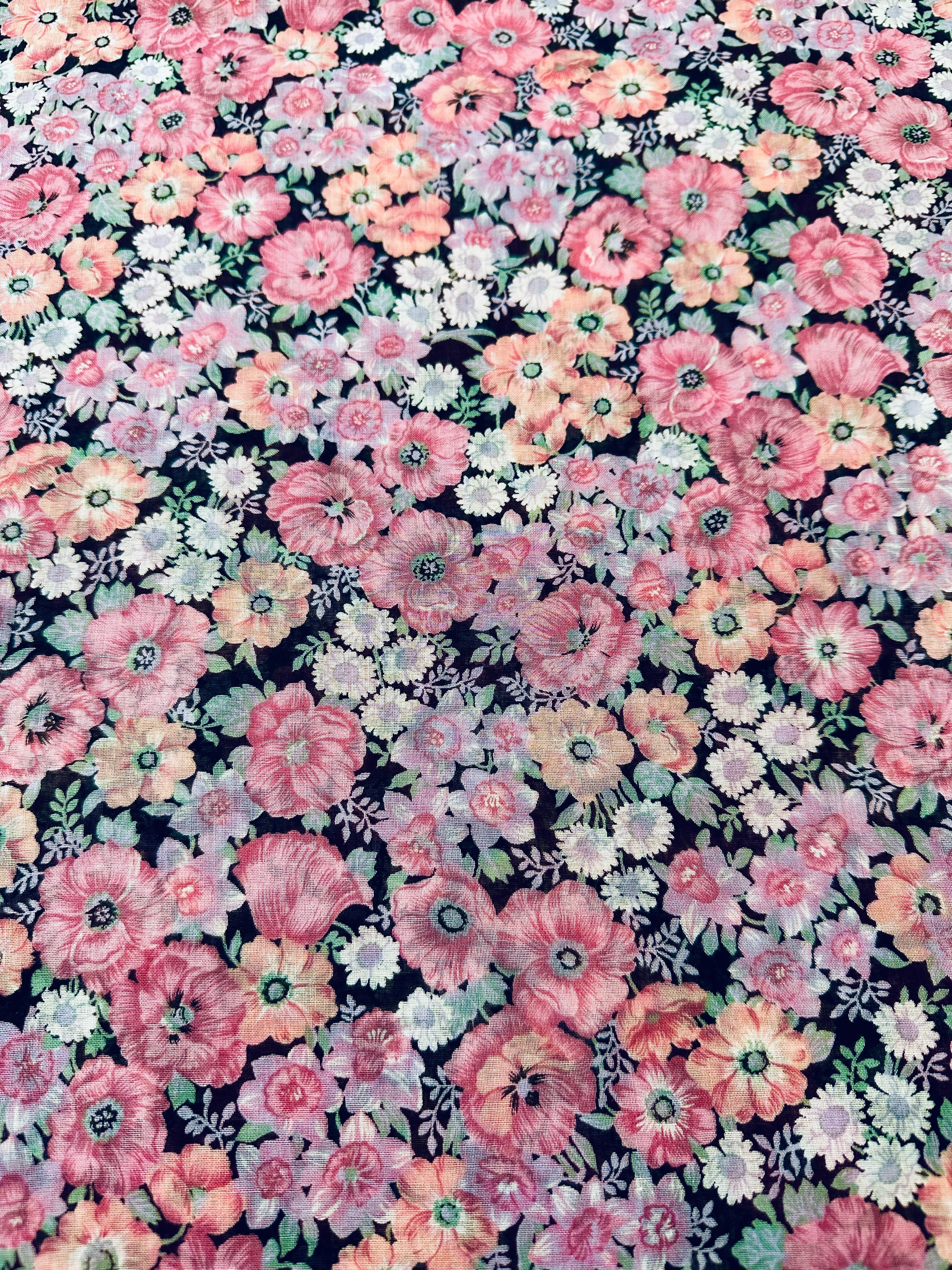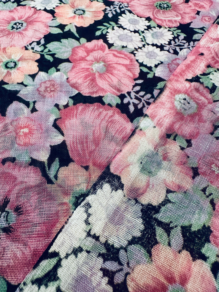 Vintage Fabric 80s 90s? Cotton Voile w/ Pink Country Floral on Black