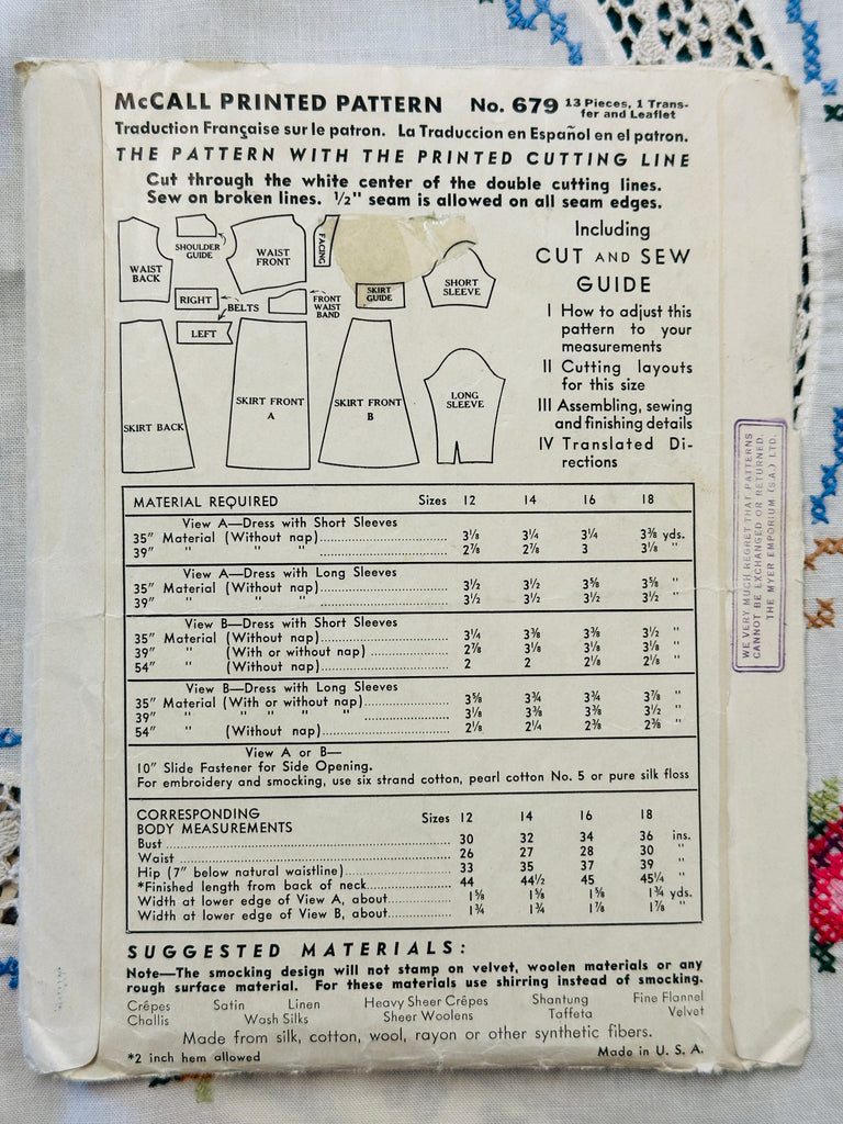 DRESS: Rare McCall Sewing Pattern 1940s Size 14 No Transfers *679