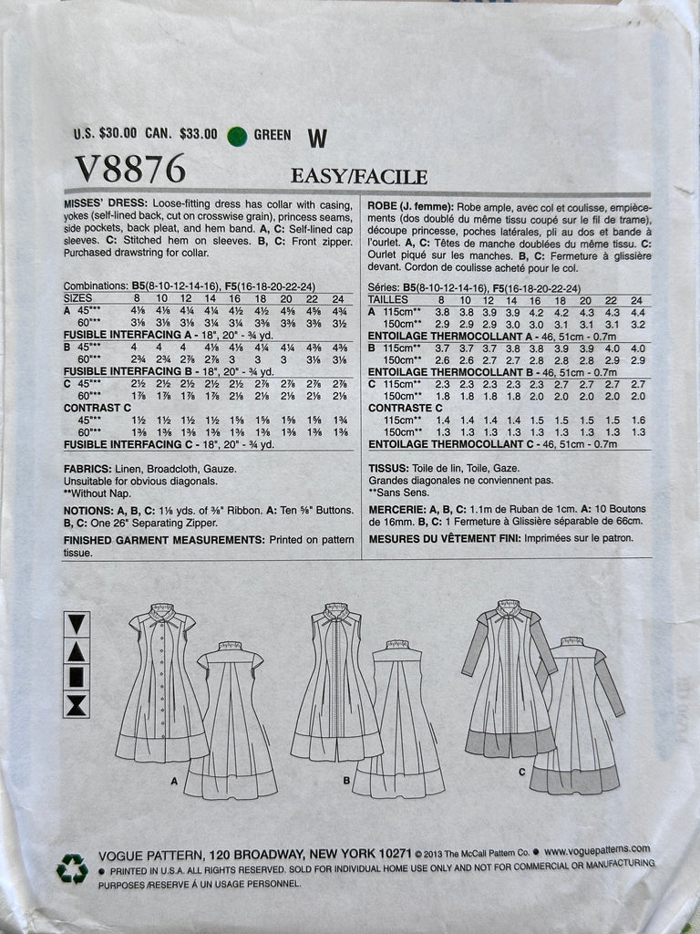 LOOSE-FITTING DRESS w/ POCKETS: Vogue Sewing Pattern Marcy Tilton 2013 Sizes 8-16 Complete FF *V8876