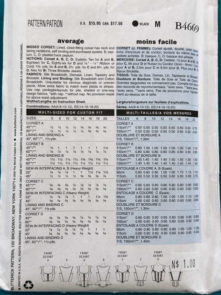 MISSES’ CORSET: Butterick Making History Sewing Pattern 2005 Complete FF Size 14-16-18-20 *B4669