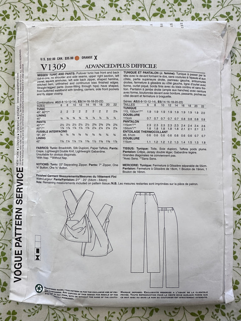 Sewing pattern: tunic and pants designed by Issey Miyake. Please read the information on the envelope in the photos to get a detailed description of cut, design and fabric recommendations.