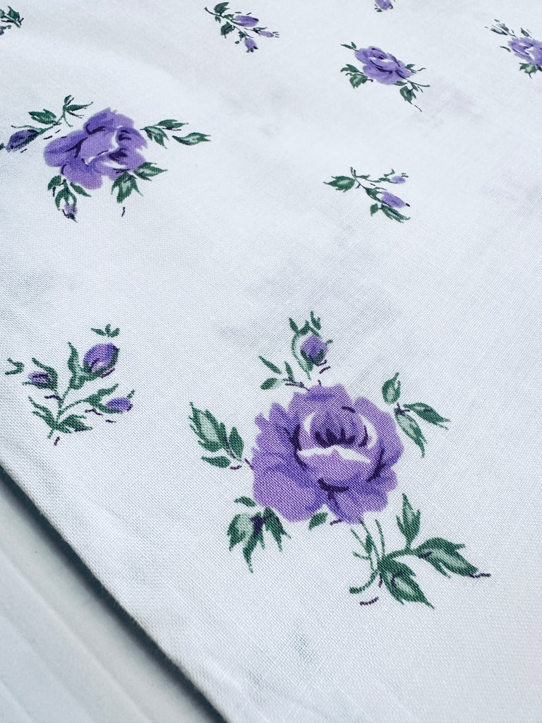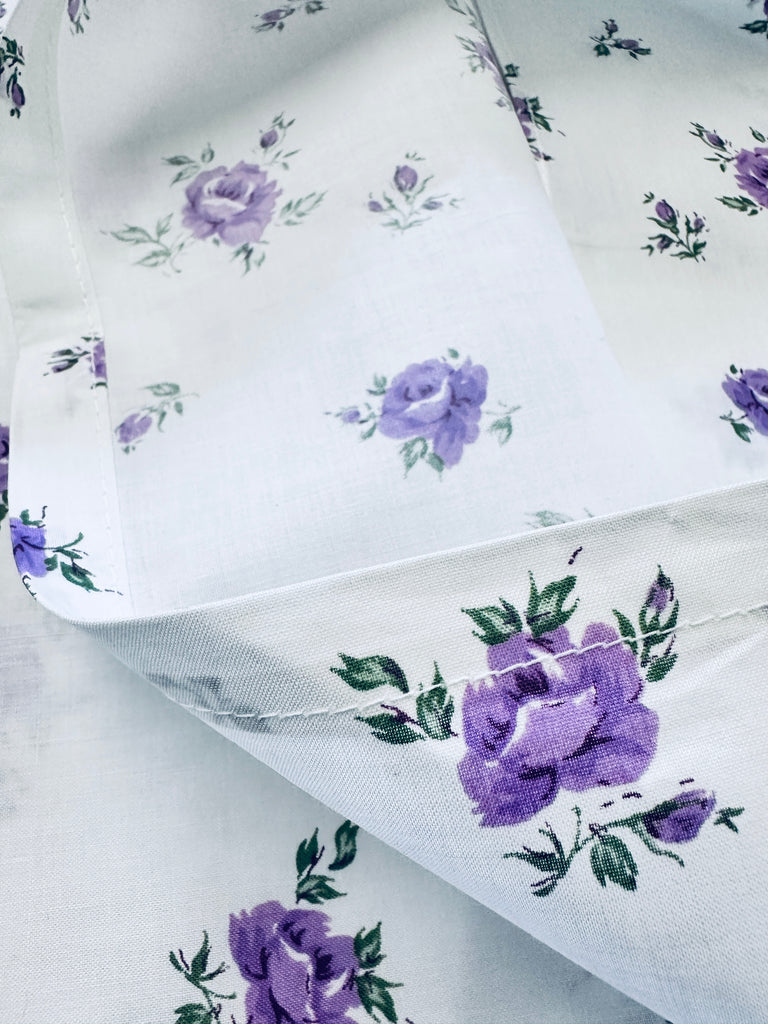PILLOW CASE Vintage Fabric Purple Green Roses on White Crispy Cotton 65cm x 42cm