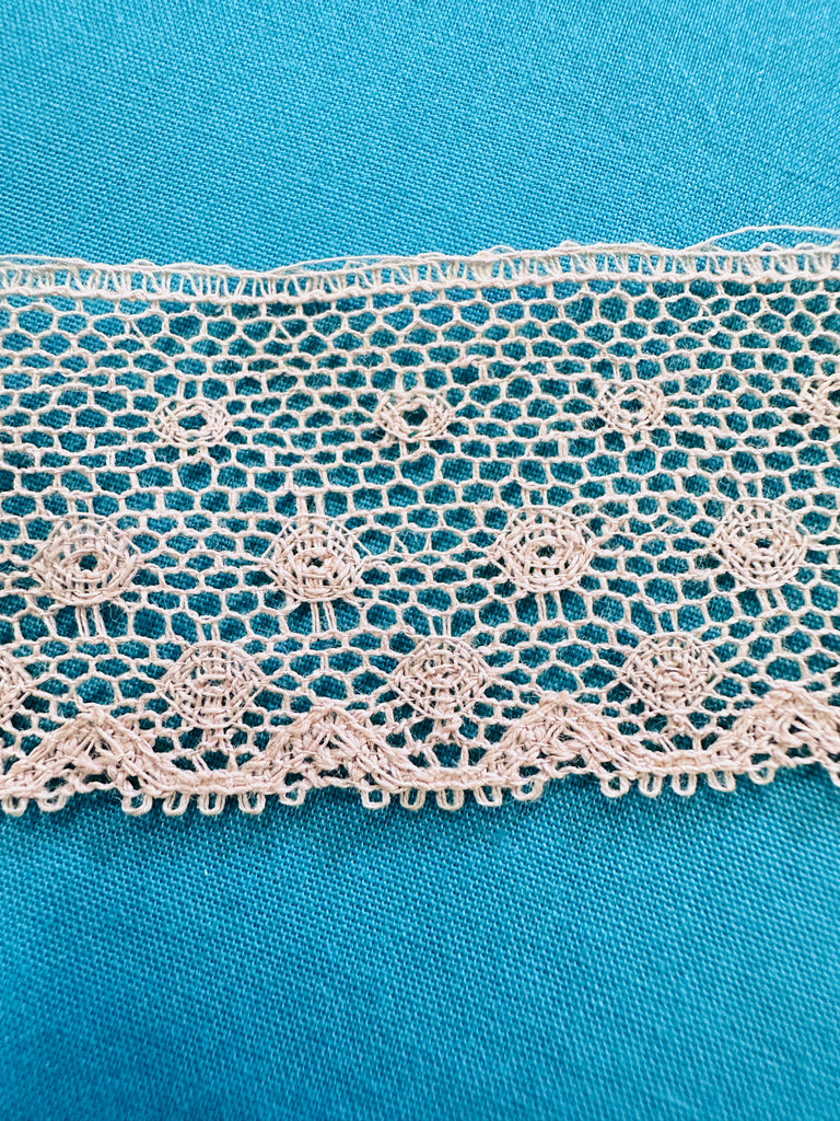 Trim: vintage 50s cotton lace trim in pale coffee. This lace was manufactured in England. It has a slightly stiff feel but it isn't a blend.