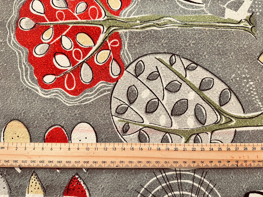 Fabric/Fibre: striking mid-century 1950s thick cotton nubby barkcloth with a cool charcoal base and a wonderful pattern of musicians and dreamers in a graphic landscape. Manufactured by Grafton and titled Homecraft.