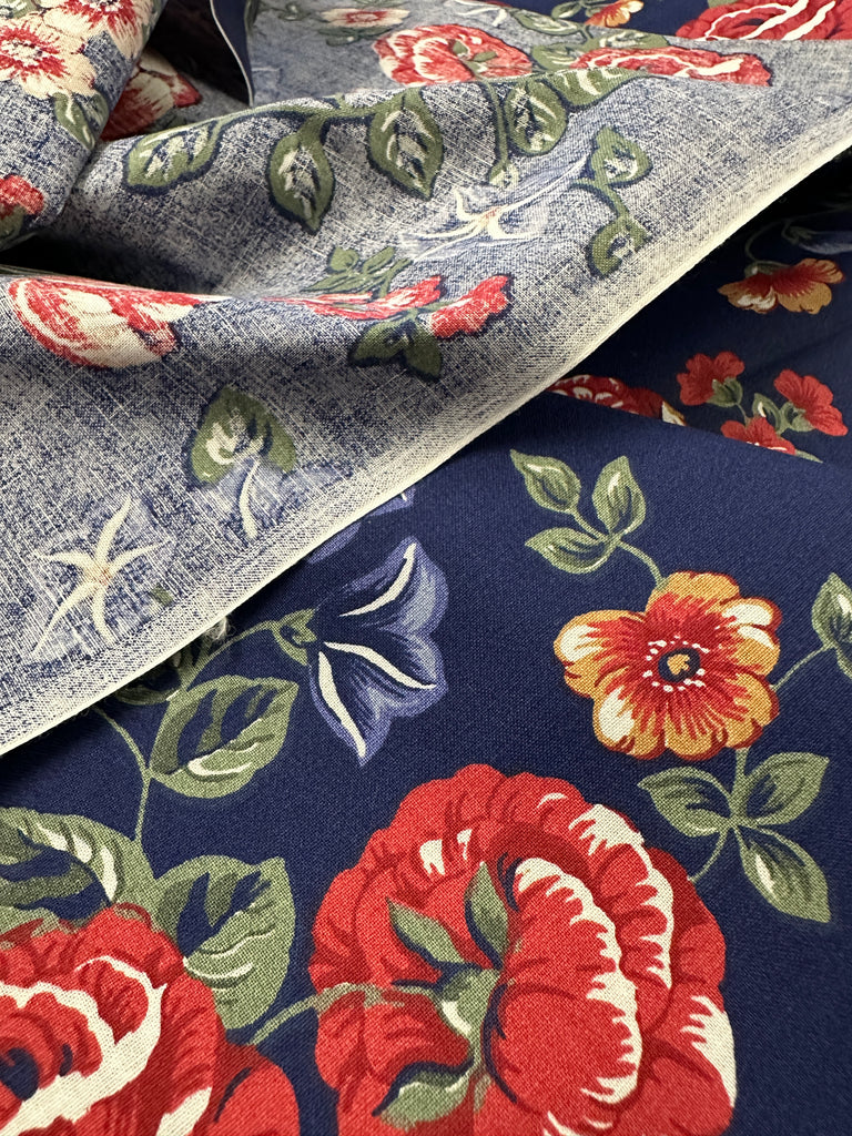 Vintage Fabric 1980s Wamsutta Blue Red Flowers on Navy Cotton Blend 112cm Wide