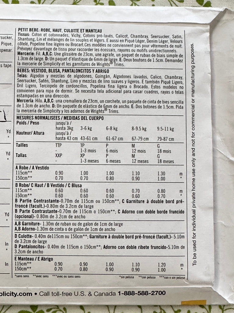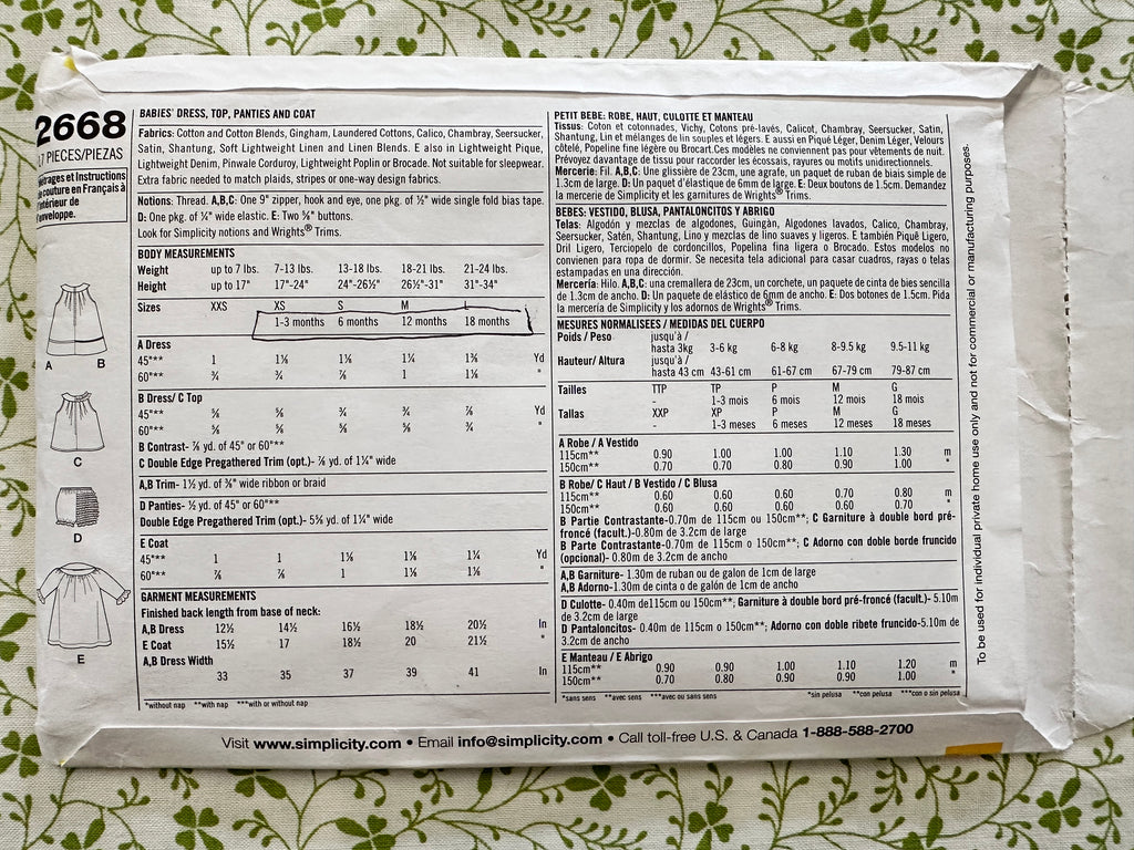 BABIES’ DRESS, TOP, PANTIES & COAT: Simplicity Sewing Pattern Sizes XXS- XS- S-M-L 1m-18m Unused FF *2668