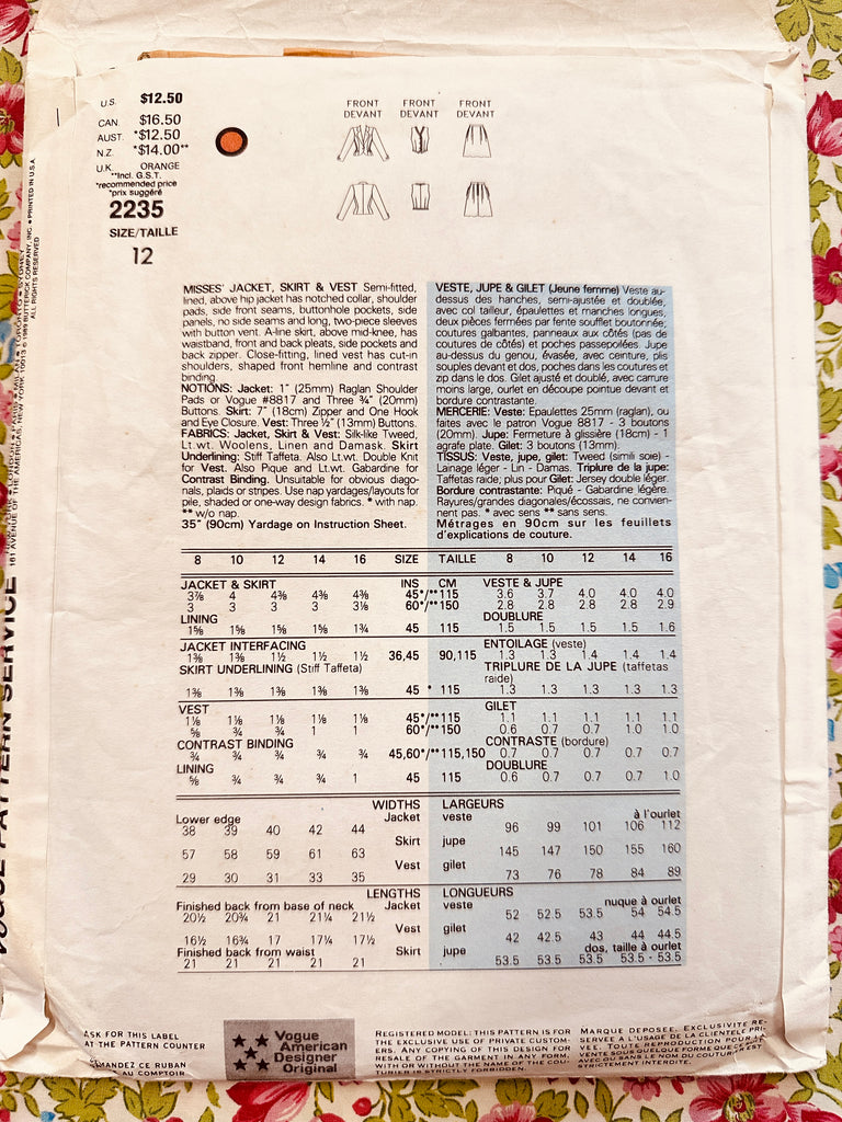JACKET, SKIRT & VEST: Vogue American Designer Sewing Pattern Bill Blass 1989 Size 12 Complete FF *2235