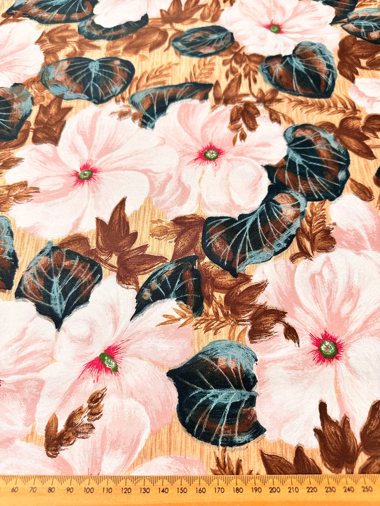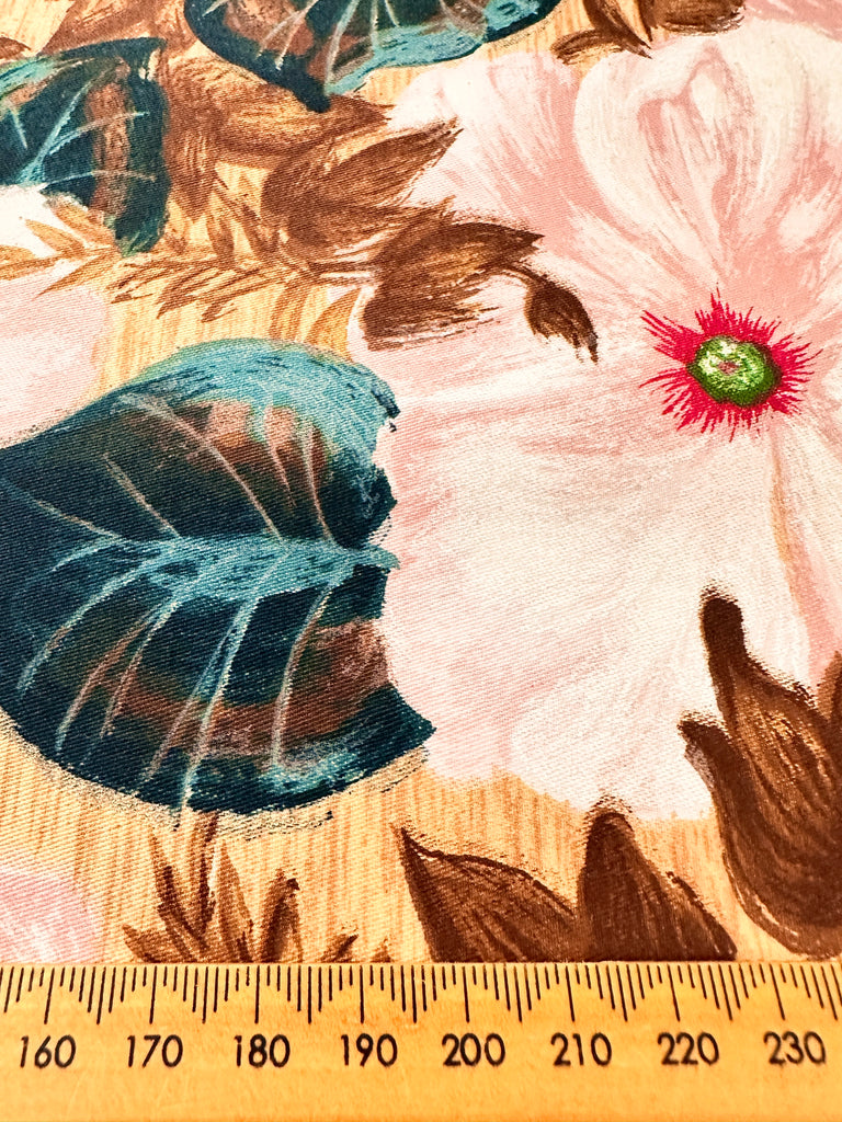 Fabric/Fibre: light weight polished cotton with a beautiful romantic floral in pinks, browns and teal. Dress weight. The browns are darker than what’s pictured.