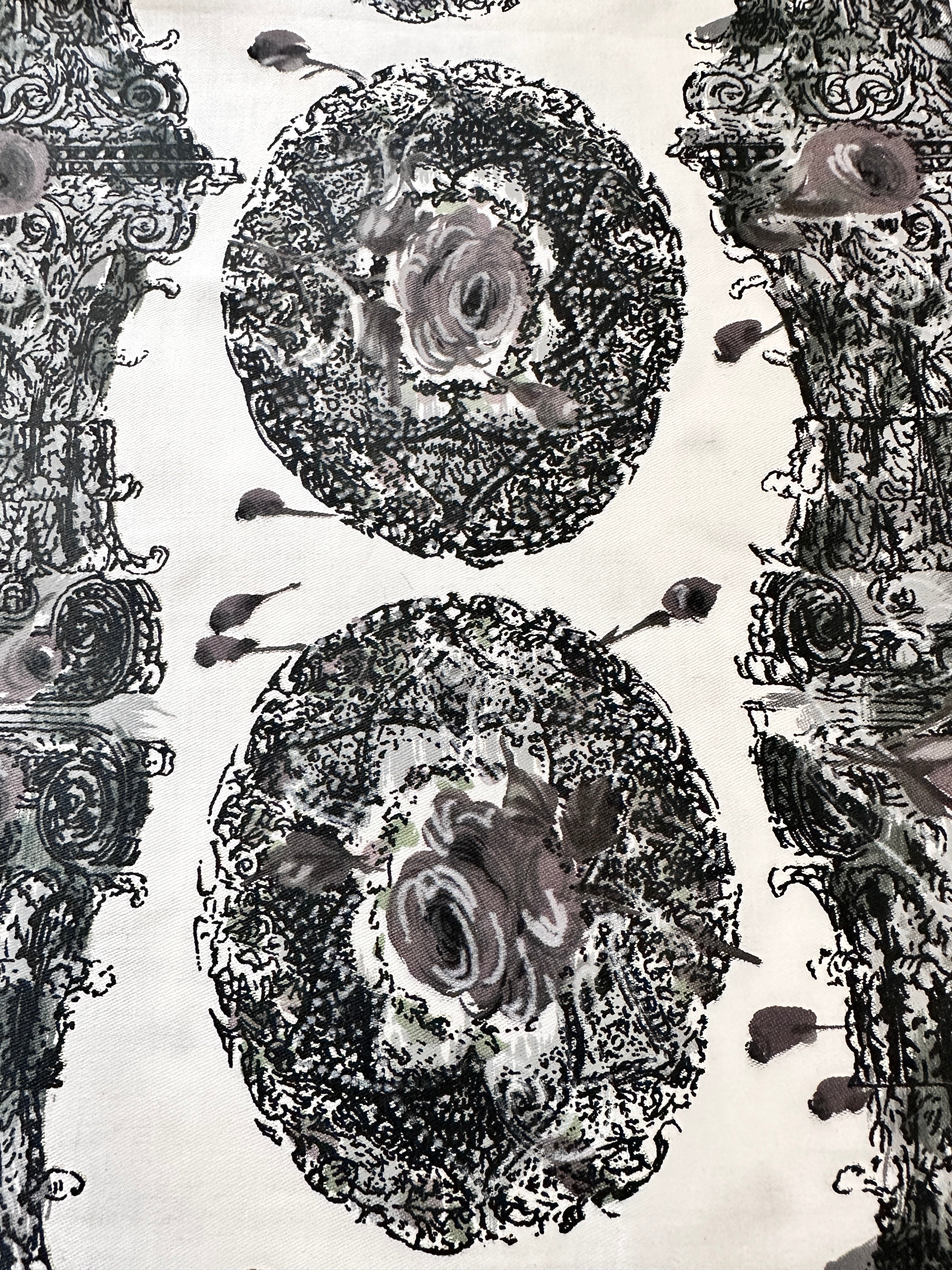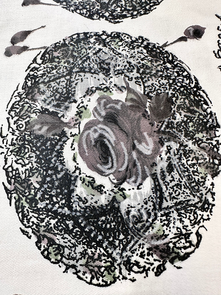 Fabric/Fibre: dramatic black roses and column print on white polished cotton.