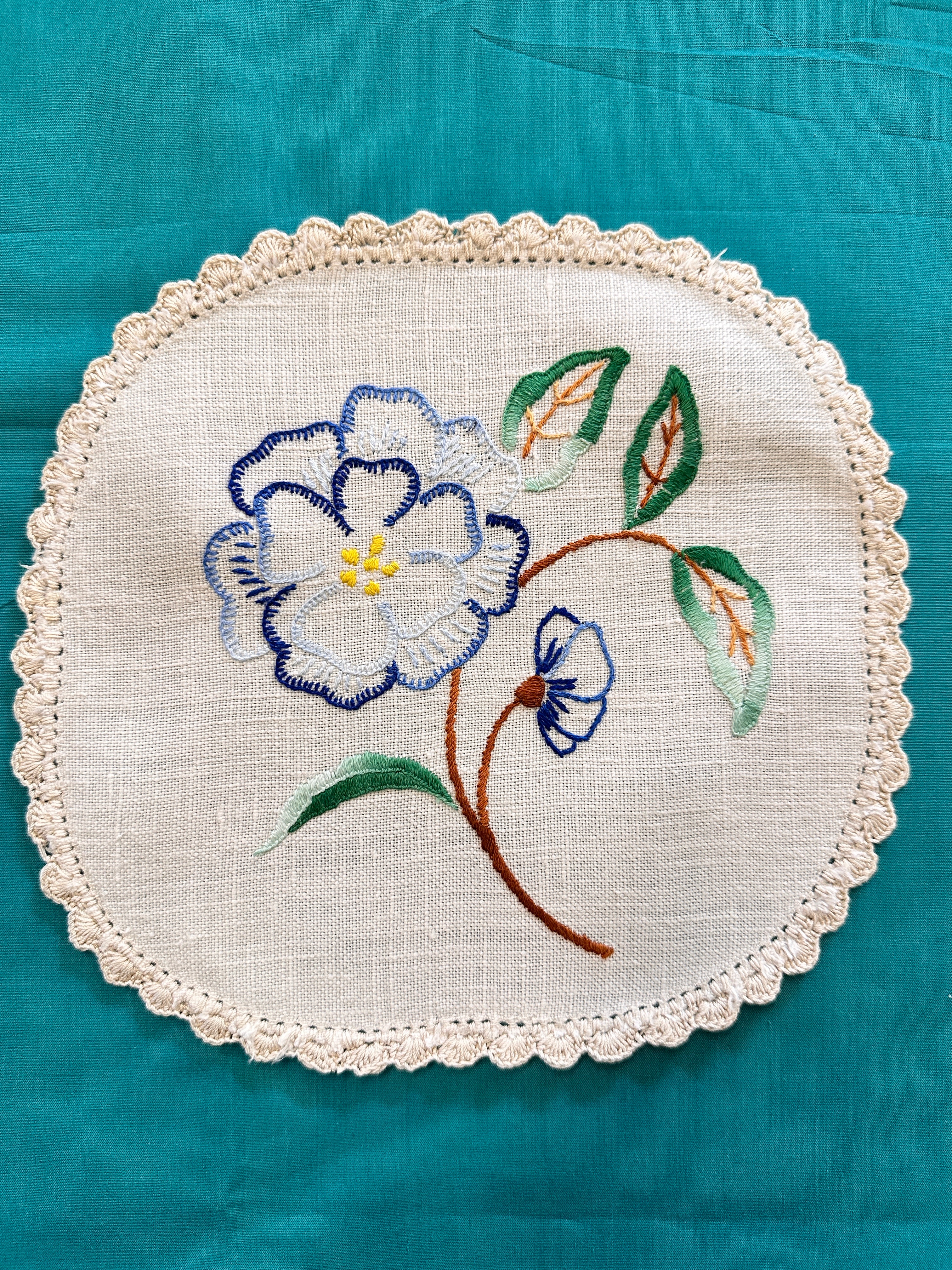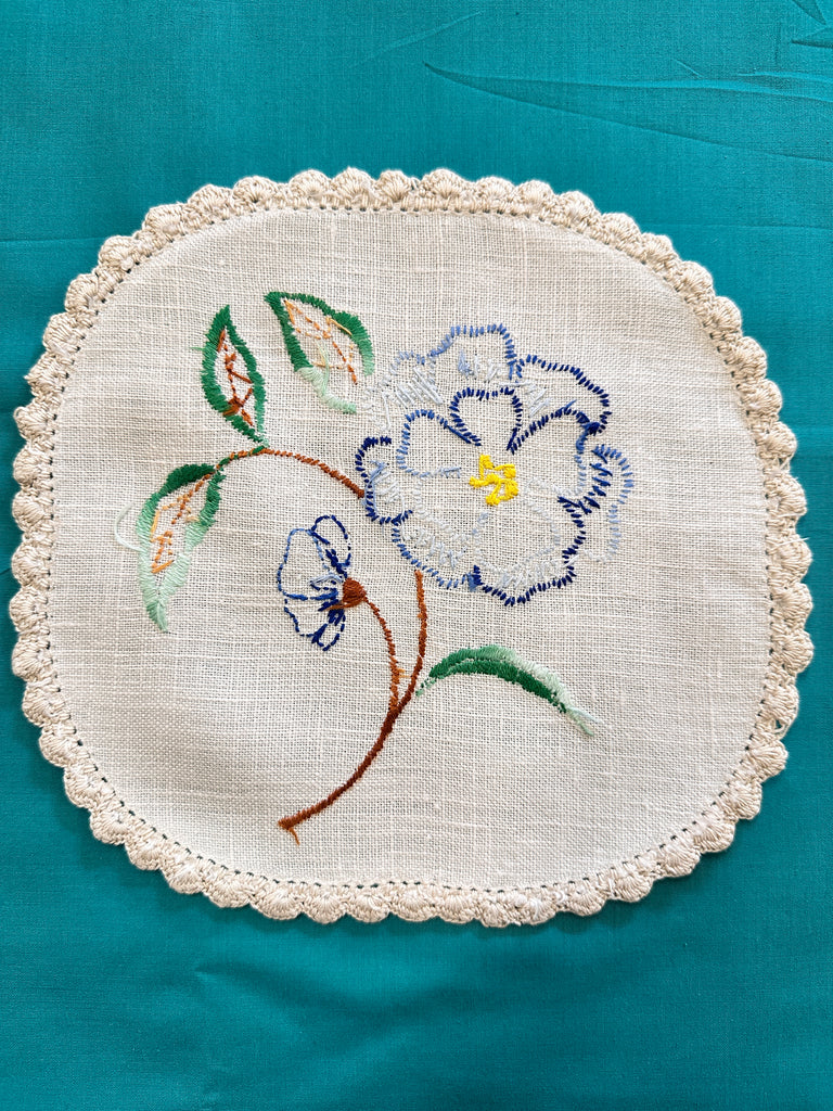 Item: vintage doily with an off-white base, finely crocheted edge and a single blue flower with blue opening bud and green leaves